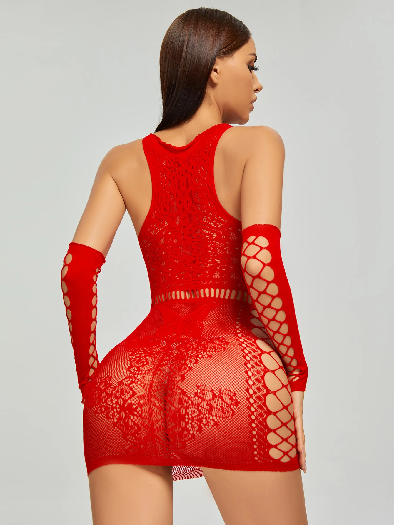 Сексуальное платье в сеточку, боди-чулки с перчатками, боди-чулки