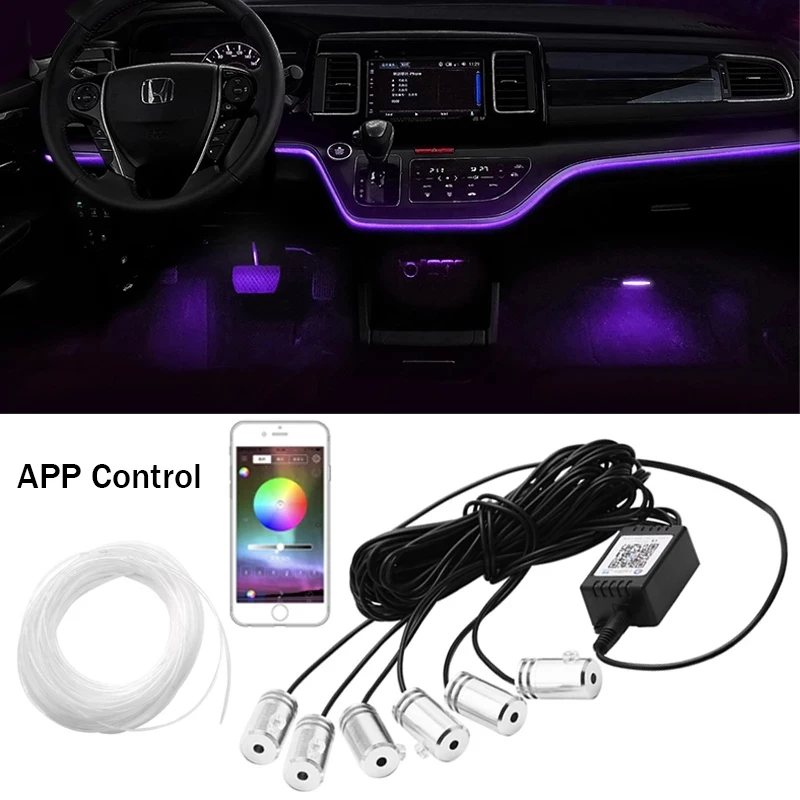 6 в 1 RGB светодиодный светильник для салона автомобиля, комплект, волоконно-оптические полосы, светильник с помощью приложения, управление музыкой, 8 м, волоконно-оптический ремешок