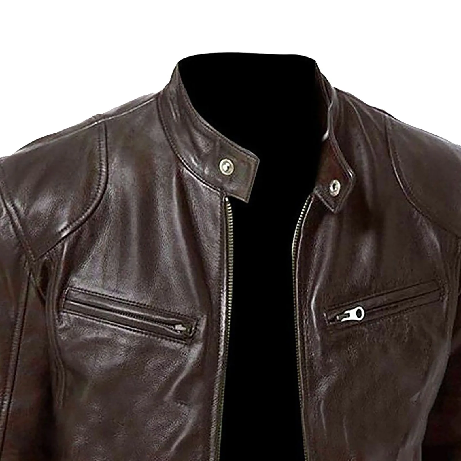 Мужская кожаная куртка, Классическая однотонная куртка с длинным рукавом и воротником-стойкой, в стиле ретро, мотоциклетный стиль
