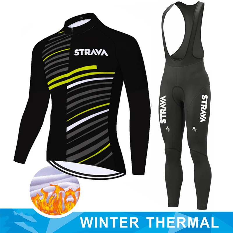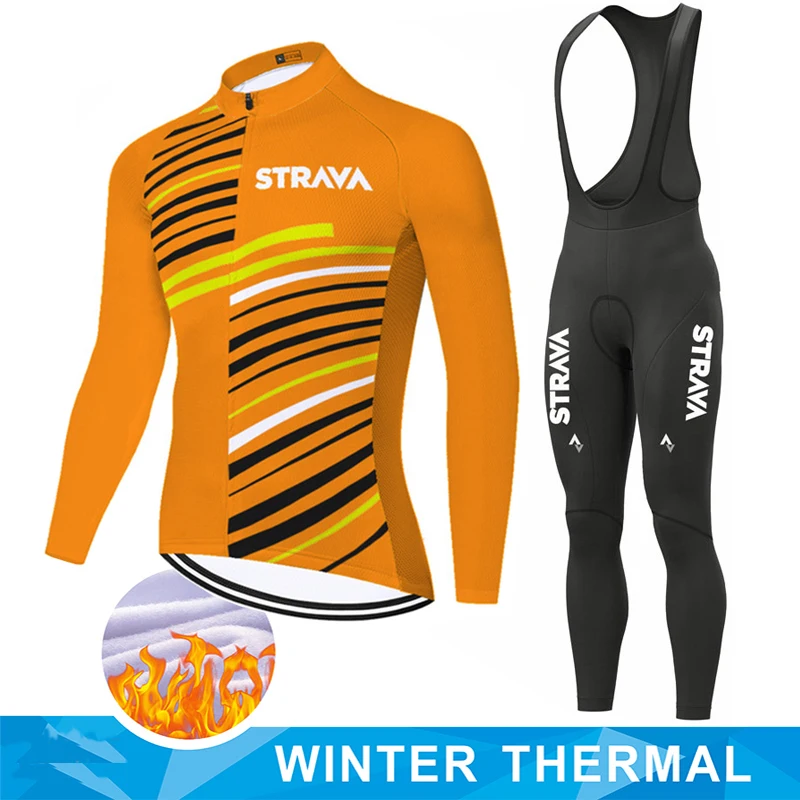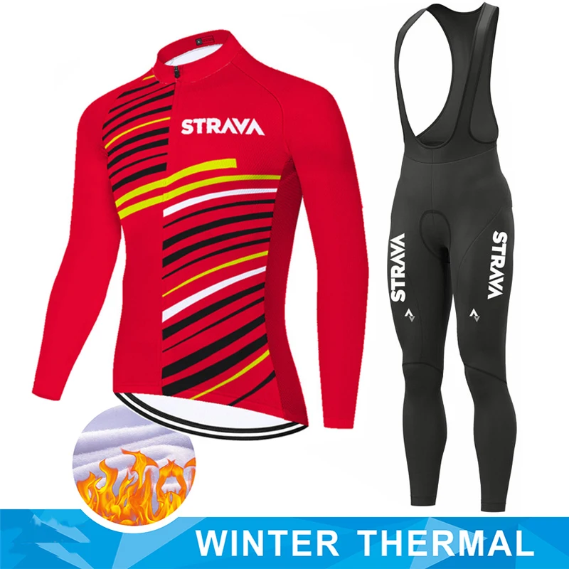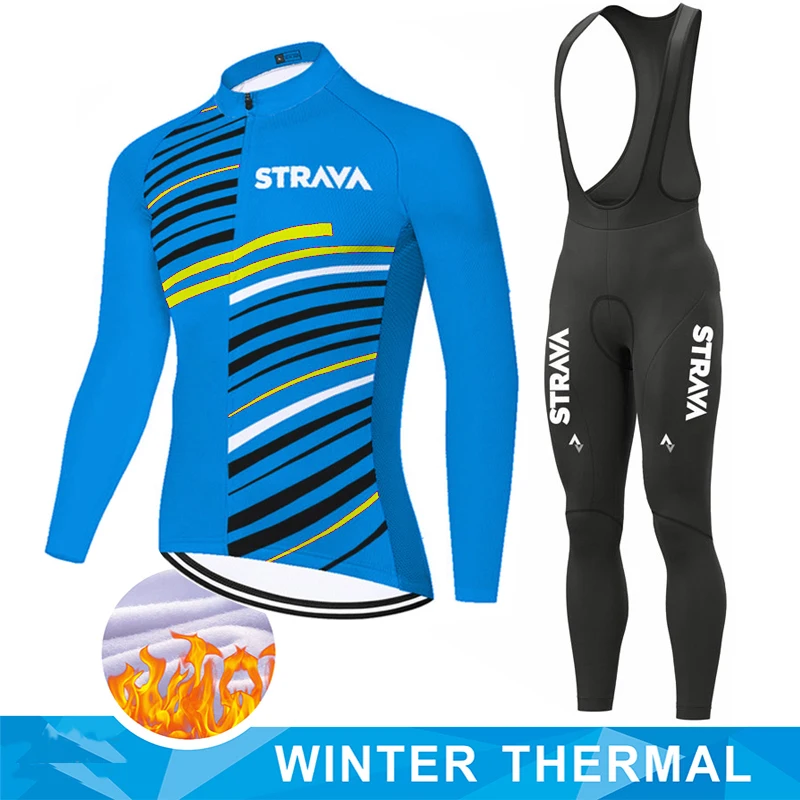 STRAVA Зимняя Теплая Флисовая Мужская велосипедная куртка с длинным рукавом Велоспорт Джерси комплект велосипедная одежда комбинезон брюки maillot ciclismo hombre