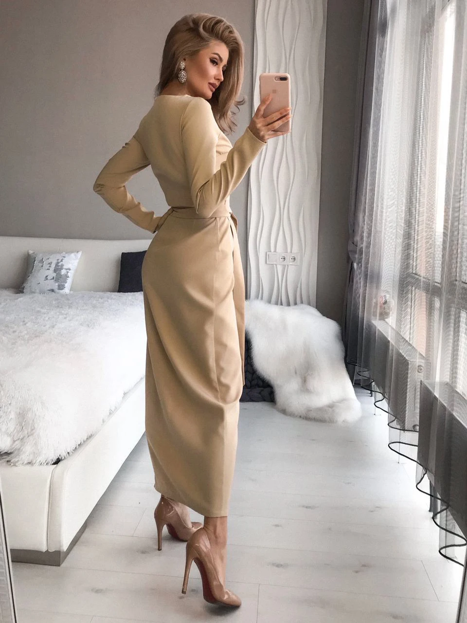 Женское вечернее платье макси, элегантное однотонное длинное платье с V-образным вырезом и разрезом, с запахом, длинным рукавом и поясом на осень