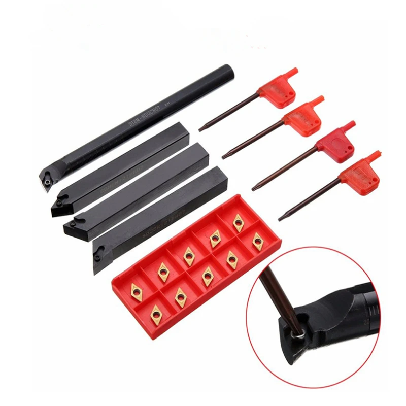 Набор резцов для токарного станка, твердосплавные лезвия DCMT07 10 шт. + 4 держателя для токарного станка + 4 гаечных ключа для токарного станка