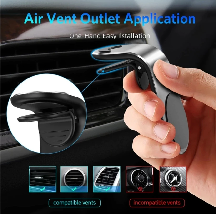 Держатель для телефона в авто поможет Вам установить гаджет в удобной близости и использовать его как навигатор, магнитолу или говорить по телефону соблюдая правила движения.Устанавливается на решётки воздуховода, за счет фиксатора-прищепки, который цепляется к одному из ребер решетки. Сам гаджет, при помощи металлической пластины, удерживается шестью мощными магнитами держателями. Пластина находится в комплекте, она устанавливается на корпус смартфона или чехол. В представленном креплении для смартфона отсутствуют зажимы, что позволяет одной рукой снять/установить девайс не отвлекаясь от дороги. Интерфейс смартфона остается в открытом доступе, а стенки его корпуса не затираются.