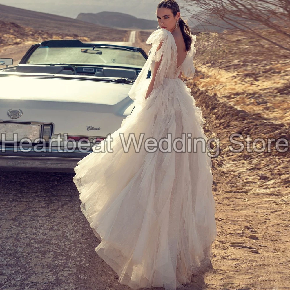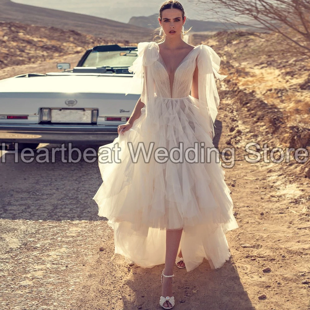 Свадебное платье без рукавов в стиле бохо, Тюлевое Многоярусное платье невесты с глубоким вырезом, открытой спиной, изящное короткое платье со шлейфом, индивидуальный пошив