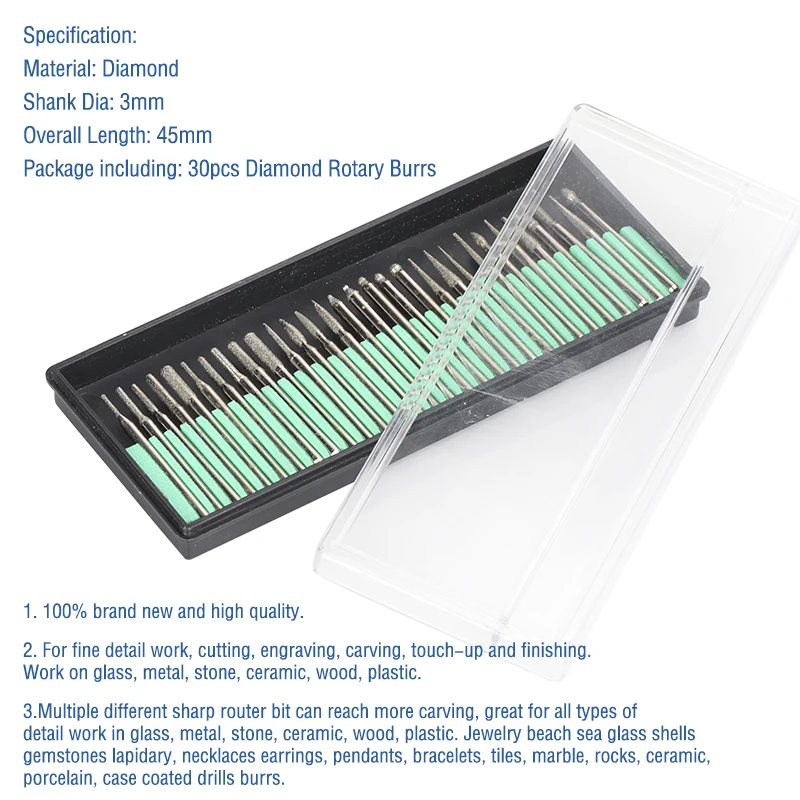1,30 шт 3 мм хвостовик набор алмазных боров с коробкой для электрической шлифовальной машины аксессуары для инструментов2. Подходит для обработки дерева, стекла, пластика, металла, камня, плитки, керамики и многого другого.3. Высокая эффективность работы, идеальный эффект шлифования и длительный срок службы.4. В основном заменяет на ручную маленькую решетку и не загрязняет пыль.5. Удобный для измельчения, простой в использовании, безопасный и надежный.6. Используется для очистки краев ногтей, формирования краев, поверхности акриловых ногтей и гелевых ногтей.7. Удаляет излишки клея и материала с нижней стороны акрилового, гелевого ногтя.