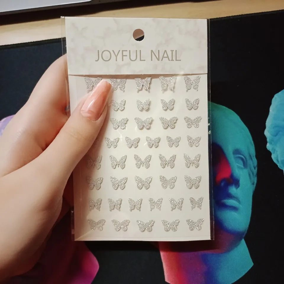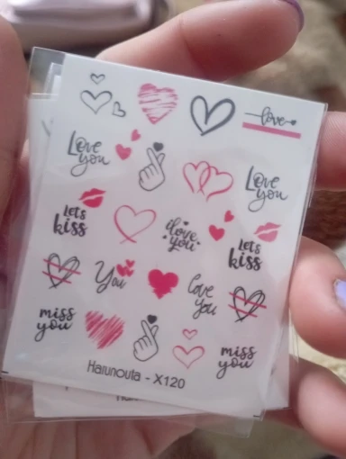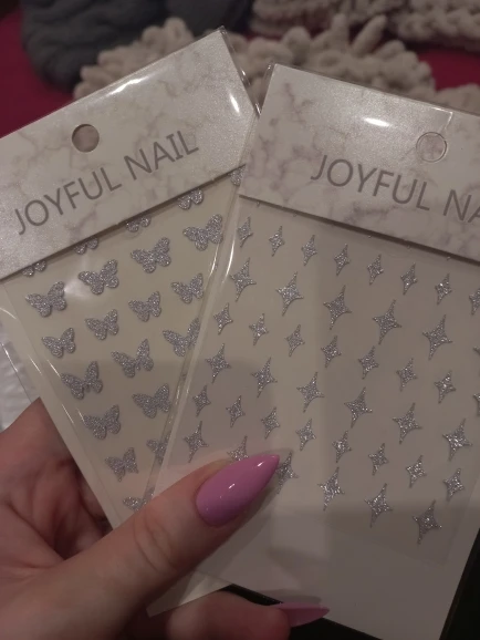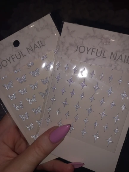 Блин очень прикольные наклейки, клеятся на ногти без труда, но вот отклеить от этикетки трудно без повреждений наклейки, она заворачивается и неправильно приделывается на ногти. Всего 10 рядов 6 из них большие, 4 маленьких. Большие повторяются. Если использовать экономно то надолго хватит, если клеить по 1-2 штуки на ноготь то на 3-5 применений хватит.