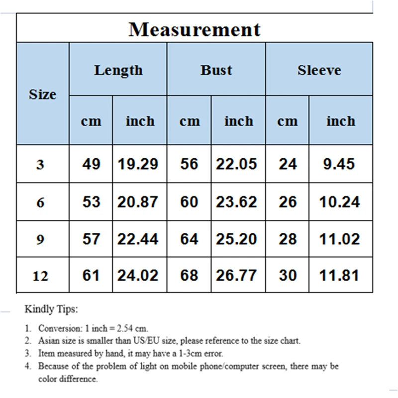 Размер: 3,6,9,12Размер 3, длина: 49 см, обхват груди: 56 см, длина рукава: 24 см (рекомендуемый рост 52-59 см)Размер 6, длина: 53 см, обхват груди: 60 см, длина рукава: 26 см (рекомендуемый рост 59-66 см)Размер 9, длина: 57 см, обхват груди: 64 см, длина рукава: 28 см (рекомендуемый рост 66-73 см)Размер 12, длина: 61 см бюст: 68 см Длина рукава: 30 см (рекомендуемый рост 73-80 см)