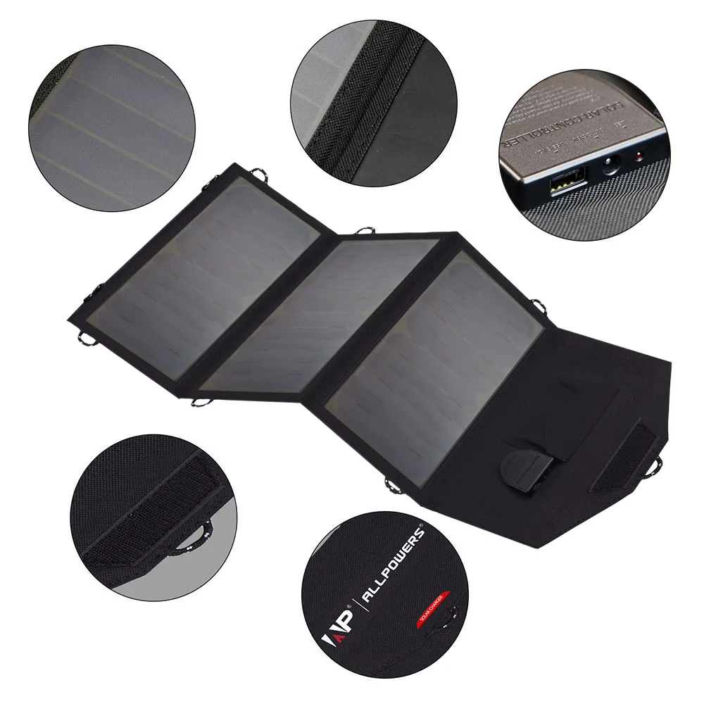 Ваше удовлетворение является нашим высшим приоритетом, свяжитесь с нами во-первых, если у вас есть какие-либо вопросыТри причины выбрать солнечные панели ALLPOWERS(1)iSolar технология, обеспечивает самую быструю зарядкуОн может автоматически регулировать ток и напряжение для достижения максимальной мощности, обеспечивая его максимально Быстрый сок.(2) оснащен регулятором напряжения для обеспечения стабильностиРегулятор напряжения ALLPOWERS может поддерживать стабильный ток вашего устройства и продлить срок его службы.(3) лучший дизайнКомпактный дизайн для портативности, с бесплатным крючком, вы можете просто повесить его на ваш рюкзак, когда на открытом воздухе.Совместимость с большим количеством устройств18 в DC порт: Зарядка ноутбуков 18V1A, 12 В автомобильный аккумулятор и другие 18 в 1A DC-питание устройств.Usb-порт 5 В: смартфоны, планшеты, внешние аккумуляторы или любые другие usb-устройства 5 В.Гарантия18 месяцев гарантии от портативное зарядное устройство ALLPOWERSВнимание1. Пожалуйста, проверьте модель, размер, напряжение и мощность вашего оригинального адаптера, чтобы обеспечить совместимость перед использованием. Пожалуйста, закройте ноутбук во-первых перед зарядкой, солнечная панель является только дизайном для экстренной ситуации, а не основным источником зарядки для ноутбука2. Apple как система безопасности, пожалуйста, отключите usb-кабель и поместите зарядное устройство в прямое солнце, если ваш iphone показывает "этот товар не поддерживается"Спецификация* Пиковая мощность солнечной панели: 21 Вт* Эффективность преобразования: >22%-25%• Выход: постоянный ток: 18V * 1A/Тип разъема для зарядки: USB 5V * 2A* Компактный размер: 300x160x20 мм/11,8x6,2x0,7 дюйма* Размер в открытом виде: 640x300x10 мм/25x11,8x0,35 дюйма* Вес: 0,48 кгКомплектация* 1 х зарядное устройство для солнечной панели* 1 x DC Соединительный кабель* 5 x Разъемы для ноутбука* 1 usb-кабель* 1 х крокодил (линия зарядки автомобильного аккумулятора)* 2 металлических крючка* 1 Руководство пользователя* 1 x Retial пакетГарантия18 месяцев гарантии от портативное зарядное устройство ALLPOWERS