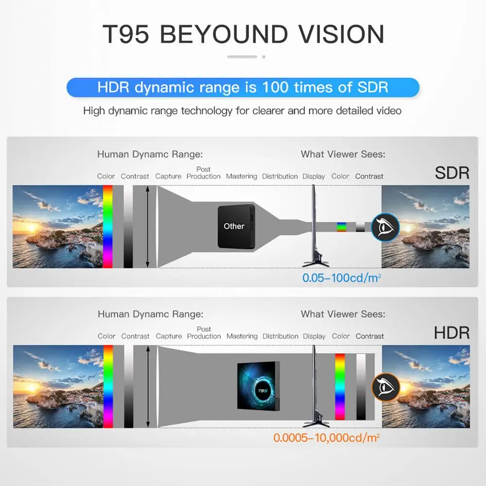 T95 4K Высокая четкость 32G Bluetooth-Совместимость 5,0 WiFi Smart TV телеприставка медиаплеерХарактеристики:В ТВ Декодер каналов кабельного телевидения принимает 2,4 ГГц Wi-Fi, который имеет более высокую, шире и надежнее Интернет соединения.С операционной системой Android 10, она дает вам изображения и видео высокой четкости.Он имеет большую память 32 ГБ для выполнения нескольких задач.Это plug and play, который удобен в использовании.Название товара: ТВ-приставкаМатериал: АБС-пластикАккумулятор пульта дистанционного управления: 2 батарейки ААА (не входит в комплект)Тип вилки: штепсельная вилка европейского стандарта, штепсельная вилка британского стандарта, штепсельная вилка американского стандарта (опционально)Операционная система: для Android 10Процессор: для Allwinner H616 четырехъядерный ARM Cortex-A53Графический процессор: для Mali-G31 MP2SDRAM: DDR3 2 ГБ/4 ГБФлэш-память: EMMc 16 Гб/32 ГБ/64 ГБВход постоянного тока: 5 В/2 а постоянного токаUSB хост: 2 USB 2,0, U диск и USB HDDКард-ридер: Micro-SD/SDHC/MMCLAN: RJ45 Ethernet порт (100 м)Wi-Fi: 2,4 ГГцФорматы декодера: VP9-10 профиль-от 2 до 6K @ 30 кадров в секундуH.265 HEVC MP-10@L5.1 до 6K @ 30 кадров в секундуH.264 AVC для HP@L5.1 до 4K x 2K @ 30fpsH.264 MVC до 1080P @ 60fpsMPEG-4 ASP @ L5 до 1080P @ 60fps (ISO-14496)WMV / VC-1 SP / MP / AP до 1080P @ 60fpsAVS-P16 (AVS +)/ AVS-P2MPEG-2 MP/HL до 1080P @ 60fps (ISO-13818)MPEG-1 MP/HL до 1080P @ 60fps (ISO-11172)Реальное видео 8/9/10 до 1080P @ 60 кадров в секундуМедиаформаты: Avi/Rm/Rmvb/Ts/Vob/Mkv/Mov/ISO/ASF/DAT/MPG/MPEGМузыкальные форматы: MP3/WMA/AAC/WAV/OGG/AC3/DDP/True HD/DTS/HD/FLAC/APEФорматы фотографий: JPEG/BMP/GIF/PNG/TIFFФайловая система жесткого диска: FAT16/FAT32/NTFSПоддерживаемые подзаголовки: SRT/SMI/SUB/SSA/IDX + USBХарактеристики: подключи и работай, большая память, надежнаяРазмеры: 10 см x 10 см x 2 см/3,94 "x 3,94" x 0,79 "(прибл.)Примечания:Благодаря светильник и экрана Цвет Товара может быть s светильник ly отличается из-за характеристик монитора компьютера.Возможны незначительные отклонения в размерах из-за различных измерений вручную.Посылка включает в себя:ТВ-приставка-1 шт.1 х пульт дистанционного управления1 х Кабель питания1 x Кабель высокой четкости1 x Руководство пользователя