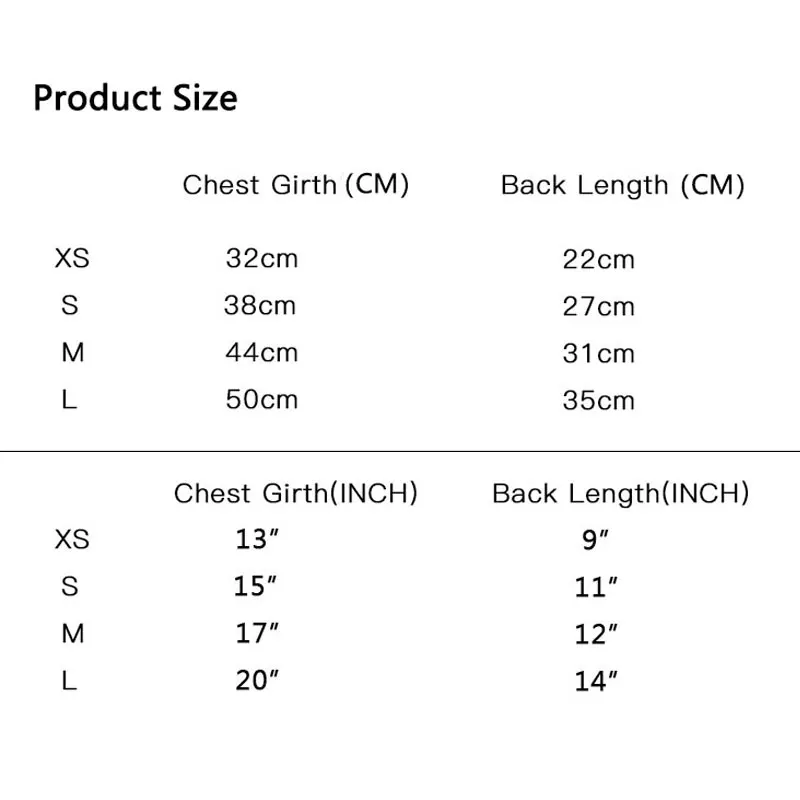 Как измерить размер собаки? Грудь: Измерьте самую толстую часть груди, добавьте 1-2 см. (Обычно требуется два lwgs) Длина: Убедитесь, что ваша собака Стоит правильно, не сидя и не лежа. Измерьте вдоль позвоночника собаки от основания шеи до 5 см передней части основания хвоста. Горловина: обхват шеи, размер 2-3 см будет лучше. Номер: Если у вашей собаки большая грудь, длинные волосы или Высокий конец размера, вы можете заказать следующий больший размер, чтобы обеспечить удобную посадку. Размеры: Размер XS для тела 22 см (9 дюймов), грудь 32 см (13 дюймов) Размер S для тела 27 см (11 дюймов), грудь 38 м (15 дюймов) размер M для тела 31 см (12 дюймов), грудь 44 см (17 дюймов) Размер L для тела 35 см (14 дюймов), Грудь 50 см (20 дюймов)