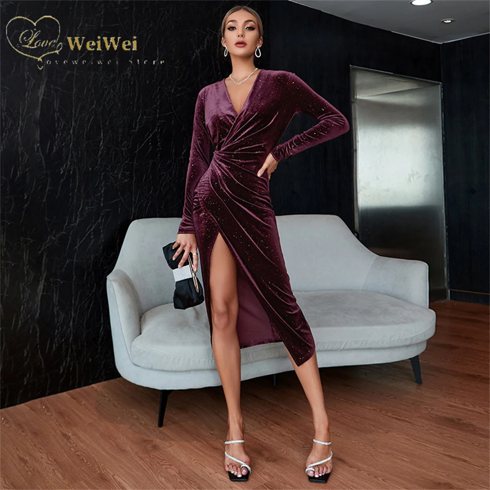 Женское вечернее платье с V-образным вырезом и длинным рукавом