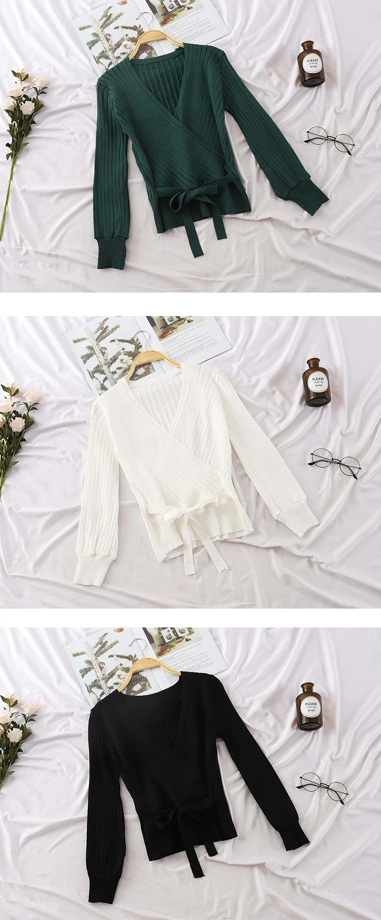 Женский свитер с рукавом-фонариком, V-образным вырезом и бантом