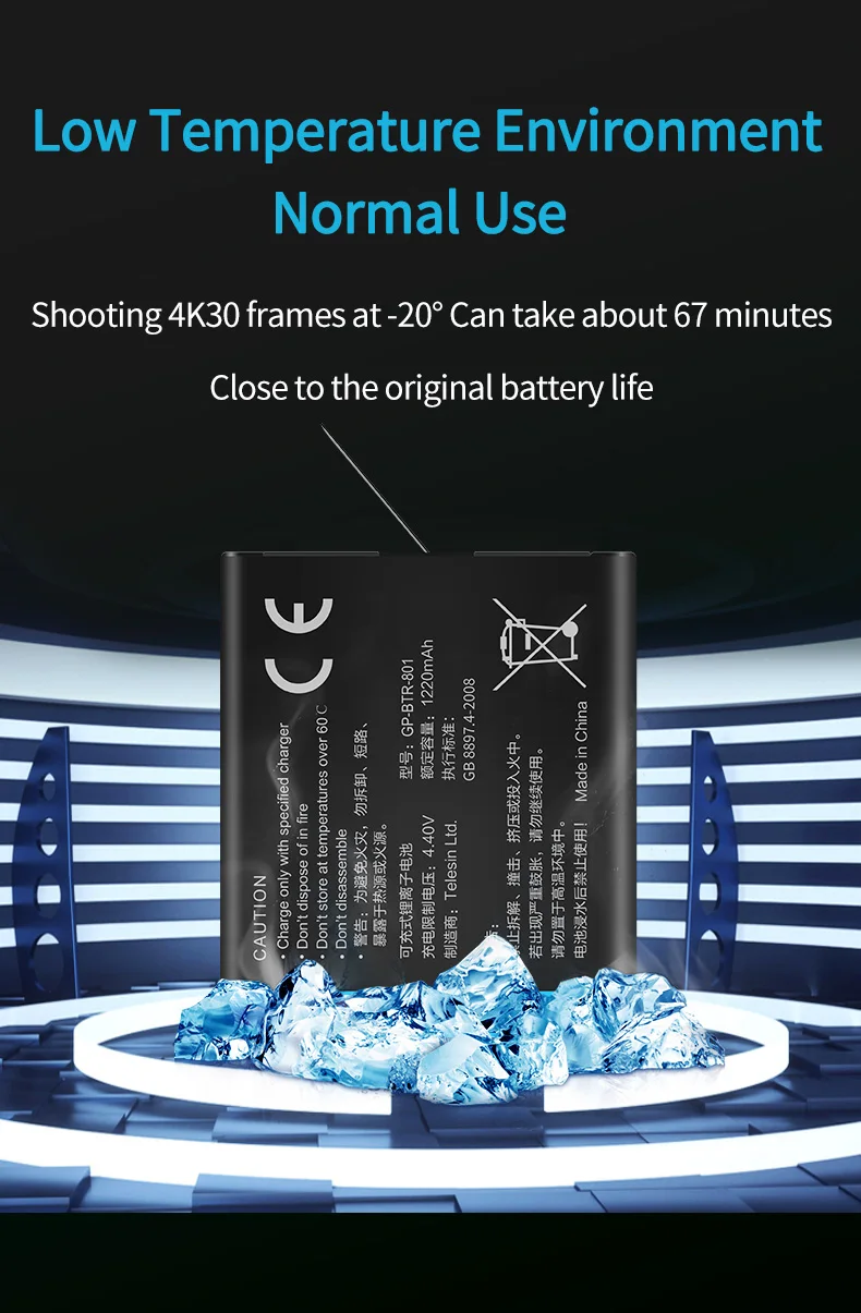 1. Аккумулятор идеально подходит для Hero 8 7 6 5 Black, такой же размер, как и оригинальный аккумулятор. 2. Обновление упаковки батареи, без всплывающего окна, полностью decoding3.высокая плотность литий-ионного целлюлоза. 4. Огнестойкий материал. Безопасная и надежная 5.съемка 4K30 кадров при-20 ° может занять около 67 минут, близкая к исходному сроку службы батареи.