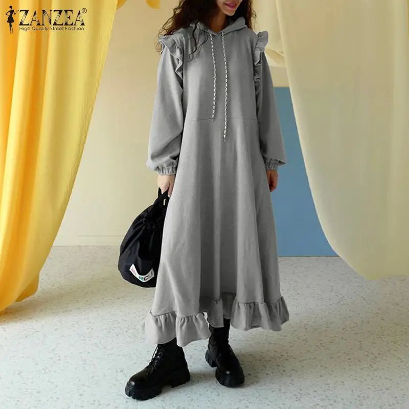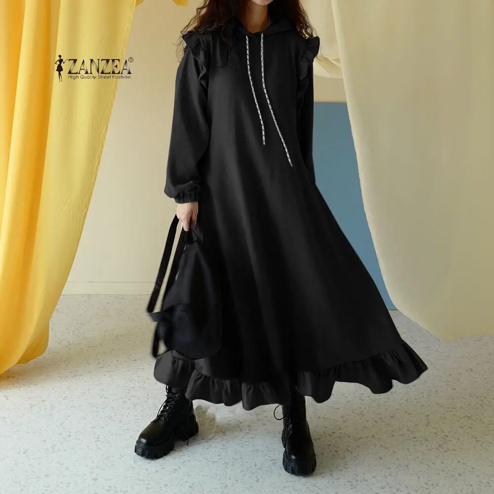 Платье ZANZEA Женское зимнее с капюшоном, Модный свитшот, сарафан с длинным рукавом и оборками, повседневный длинный пуловер с капюшоном
