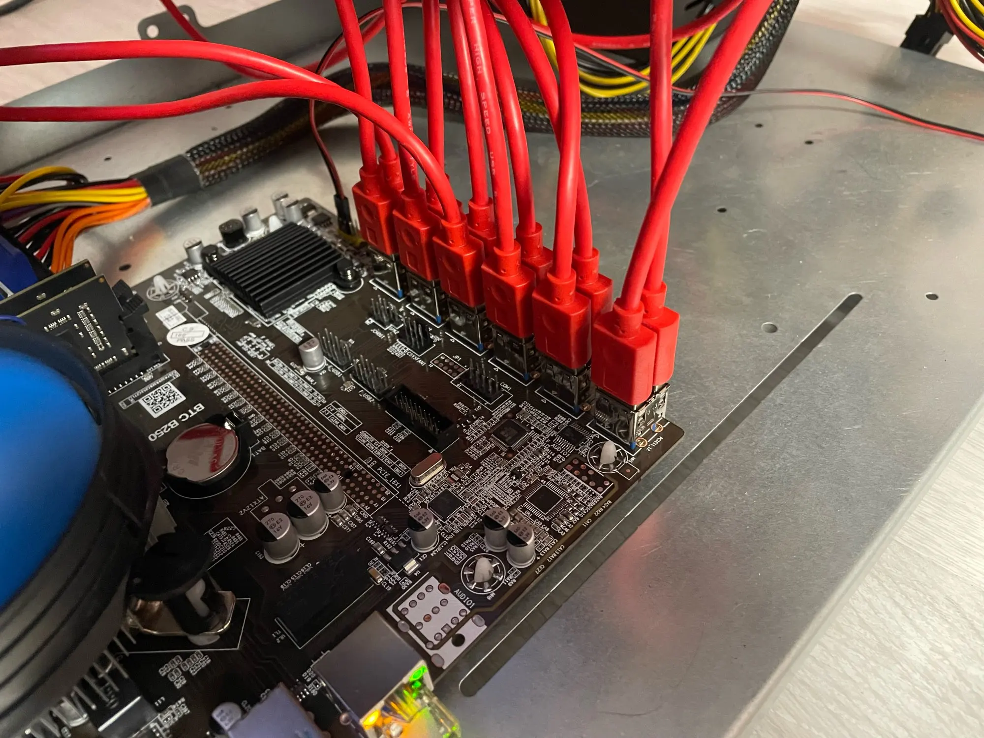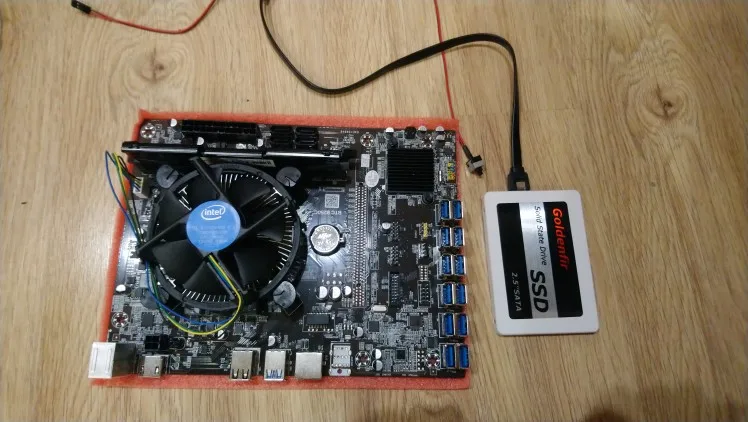Без сата кабеля прислали, но плата работает 9 карт запустил, удлинители юсб 3.0 1.5м не работают, хз как ее соединить на 12 карт нормально 60 см кабелями