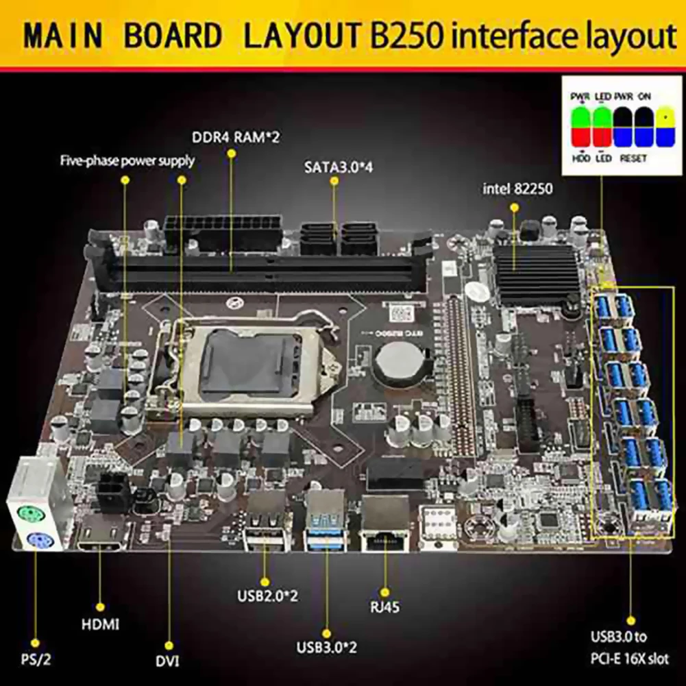 Инновационный дизайн, преобразование PCIE 1x непосредственно в интерфейс USB3.0, уменьшение промежуточных звеньев передачи, снижение затрат, снижение затухания сигнала и делает непрерывную долгосрочную работу более стабильнойОбновление до совместимого hdmi-совместимого интерфейса дисплея высокой четкости, удобный и практичныйПоддержка процессоров 6-го и 7-го поколения, LGA1151 прост в использовании, низкая стоимость, Низкие инвестиции и эффективная ДобычаЭтот продукт использует высококачественные материалы, прочный, имеет длительный срок службы и является прочным и стабильным в использовании.Расширение 12 портов USB3.0, подключи и работай, удобно и без проблемПроцессор: поддерживает все процессоры серии LGA1151Чипсет: Использование высокоскоростного чипсета Intel B250Память: 2 * DDR4 DIMM слот памяти, поддержка 2133/2400 МГц памяти, максимальная поддержка 16 ГбЧип дисплея: Интегрированная графическая карта Intel HD Graphics coreВыход Дисплея: HDMI-совместимый/12 * USB3.0 для PCI-E16XСеть: 1 * RTL8111F гигабитный чип EthernetПамять: интерфейс жесткого диска 4 * SATAИнтерфейс ввода/вывода: 2 интерфейса USB3.0; 4 интерфейса USB2.0; 1 интерфейс, совместимый с HDMI; 1 гигабитный сетевой интерфейс RJ45; 1 интерфейс PS/2Встроенный интерфейс ввода/вывода: 1 * USB3.0 pin; 2 * USB2.0 pin; 1 * COM pin; 1 * F-PANEL кнопка функции передней панели и индикаторная вилка иглыBIOS: AMI 64 Мб флэш-памятьТип источника питания: Поддержка ATX24P + ATX4PОбратите внимание: внешний вид различных партий продуктов может отличаться, что не повлияет на использованиеРазмер: 230x185ммМатериал: PCBЦвет: черныйПосылка:1 * материнская плата1 * ЦП1 * кабель переключения (случайный цвет, не принимайте указанный цвет)Только вышеуказанная посылка, другие товары не включены.Примечание: светильник и различные дисплеи могут привести к тому, что цвет товара на картинке немного отличается от реального. Допускается погрешность в измерениях +/- 1-3 см.