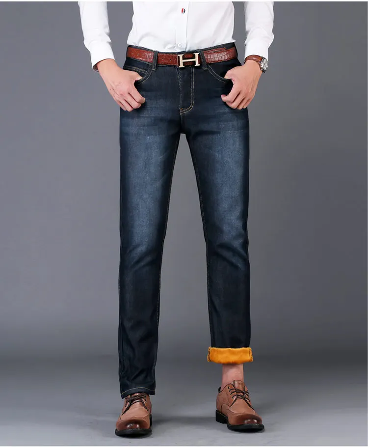 2021 повседневные мужские джинсы с флисовой подкладкой, прямые джинсы в деловом стиле, Стрейчевые джинсовые брюки, зауженные классические джинсы-ковбои для молодых мужчин