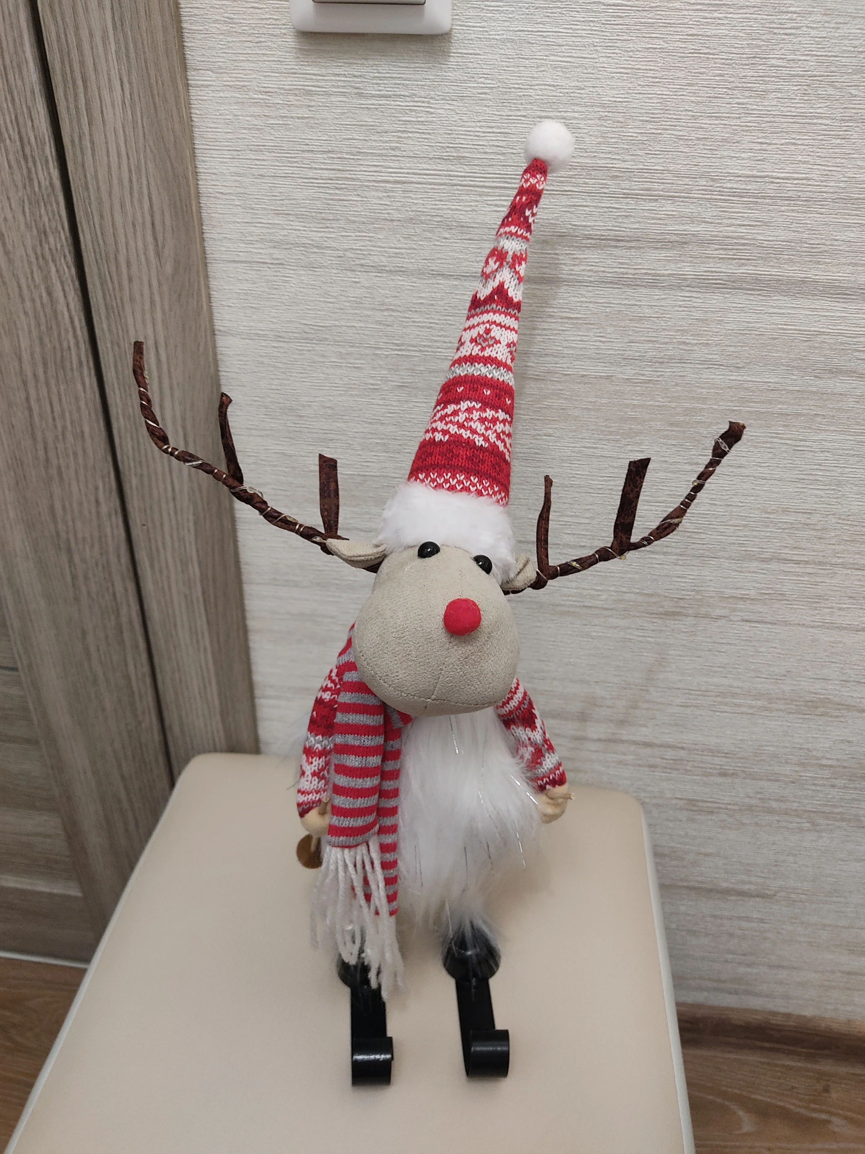 Олень не 50 см а 45, и он совсем маленький. Ожидала вообще другой размер, и 45 см это если его просто вытянуть вверх и измерять от самого помпона на шапке(((( Из плюсов- рожки светятся, палки не поломаны, лыжи металлические, сшит аккуратно.