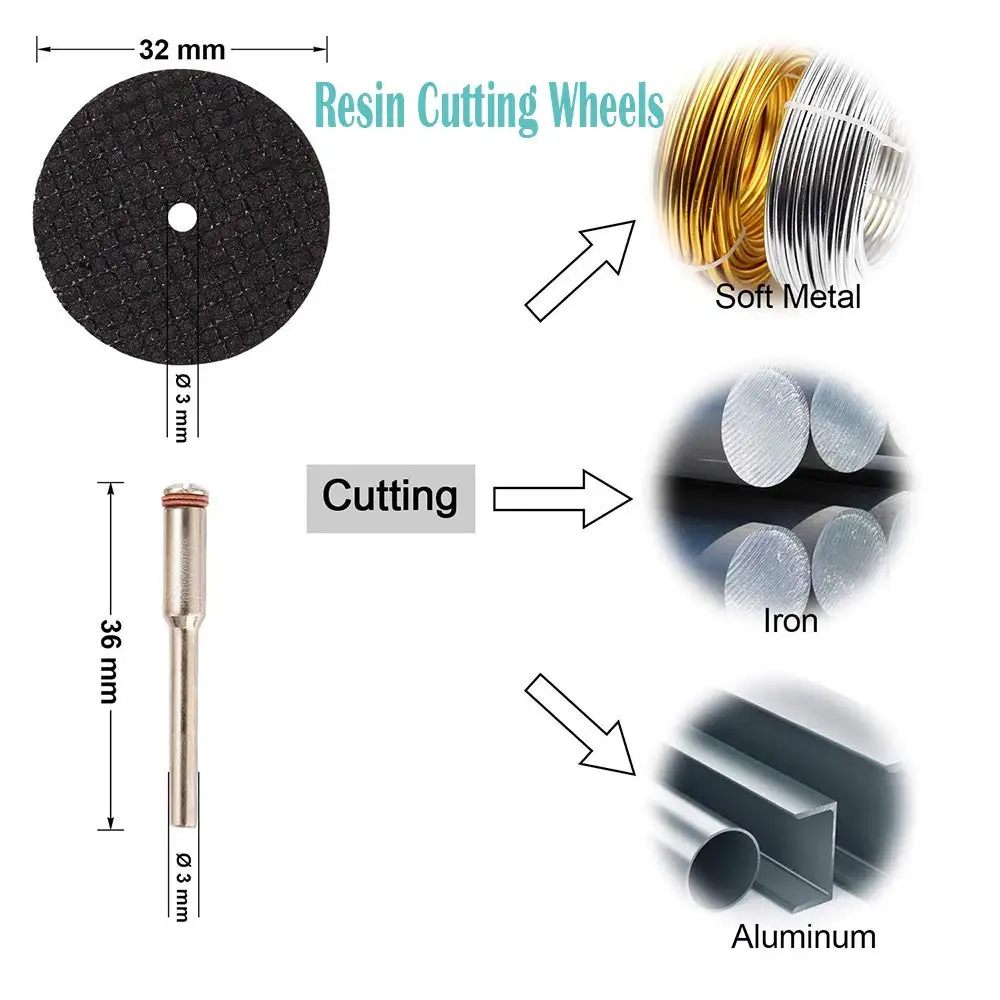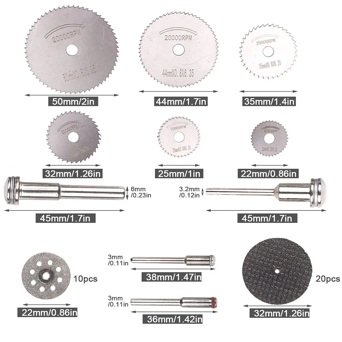 Материал: HSS/алмаз/смолаДиаметр хвостовика: Approx.1/8 " (3 мм/3,175 мм/6 мм)HSS пильные диски диаметр: 22/ 25/ 32/ 35/ 44 мм/50 ммДиаметр алмазного режущего диска: 22 ммКаучук режущий диск Диаметр: 32 мм