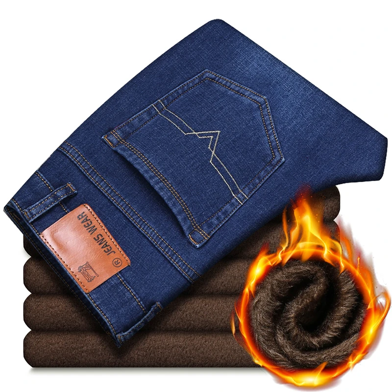 Мужские теплые джинсы с флисовой подкладкой, повседневные свободные прямые Стрейчевые брюки из денима в деловом стиле, Осень-зима 2021