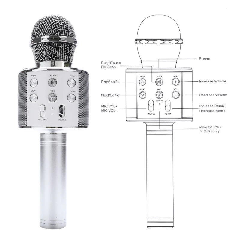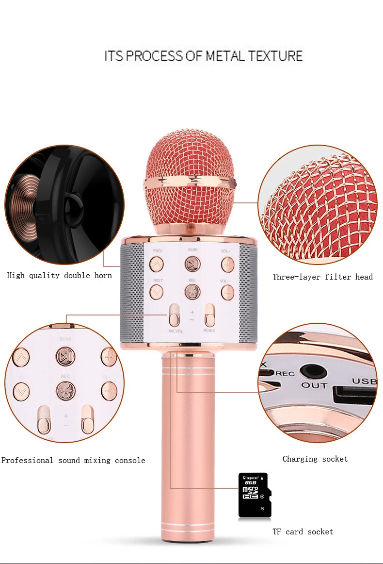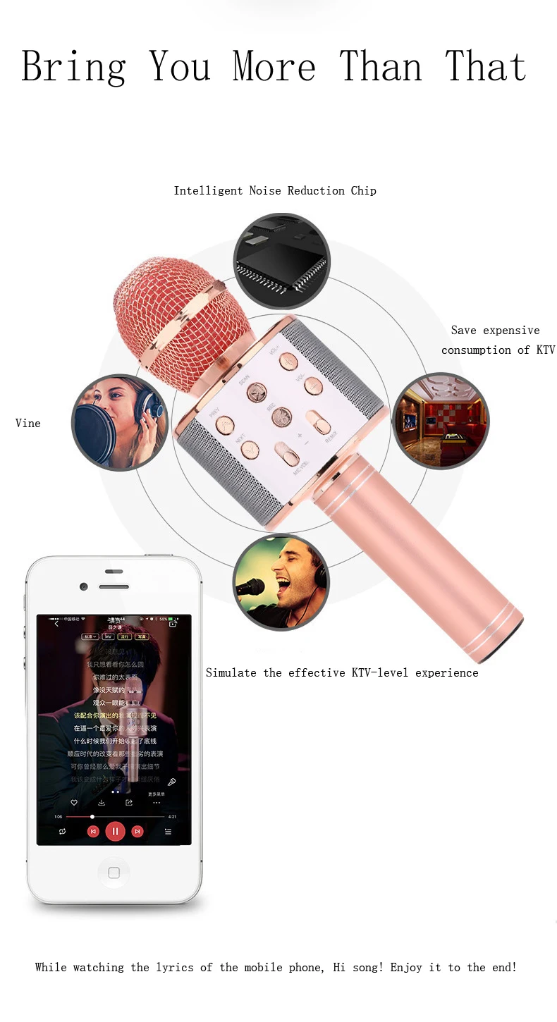 Микрофон относительно маленький и не занимает слишком много места в сумке. Он очень портативный.Внешний вид принимает принцип механики человеческого тела, его ручка спроектирована разумно, и его сцепление более удобно. Рука не будет чувствовать болезненность при использовании в течение длительного времени.Это может сделать беспроводные bluetooth-соединения на большие расстояния. Это очень практично и удобно.Он имеет широкий спектр применений. Подходит для пения, игр, вечеринок и семейных развлечений.Металлический Чехол-защита и безлиповый звук без потерь создают высокое качество прослушивания.
