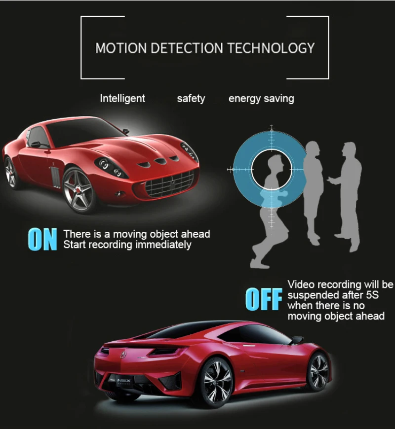 3. Мониторинг всех погодных условий, когда Обнаружение движения включено, когда перед объективом находится движущийся объект в определенном диапазоне, видео будет автоматически включаться, чтобы защитить ваш автомобиль весь день.