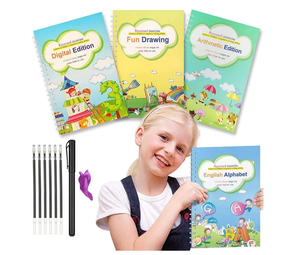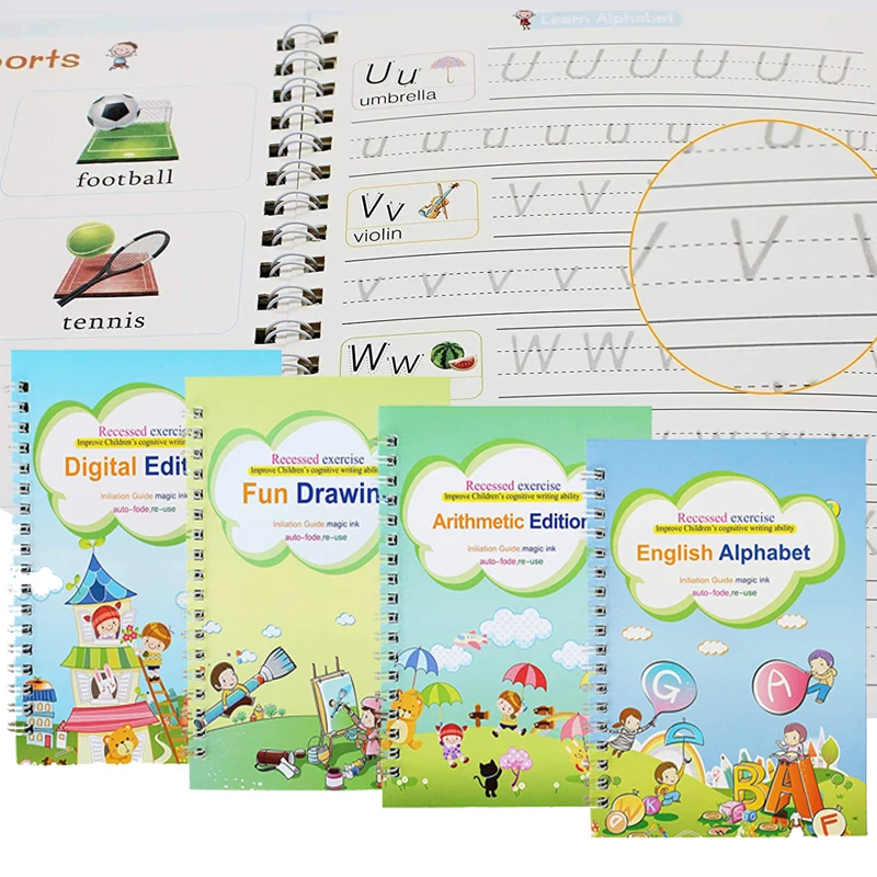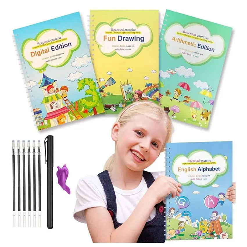 4 книги + ручка, искусственная кожа, английский для детей, многоразовая Волшебная книга для письма, Бесплатная Чистка, детская книга для рукописного письма, тетрадь