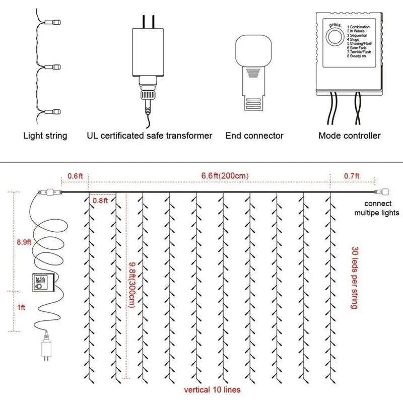 Описание: Название: светильник для штор Размеры: около 6,6 футов х 9,8 футов Светодиодный цвет: теплый белый Количество светодиодов: 300 Водонепроницаемость: IP44 Напряжение: 110-240 В Свинец: около 9,9 средства ухода за кожей стоп