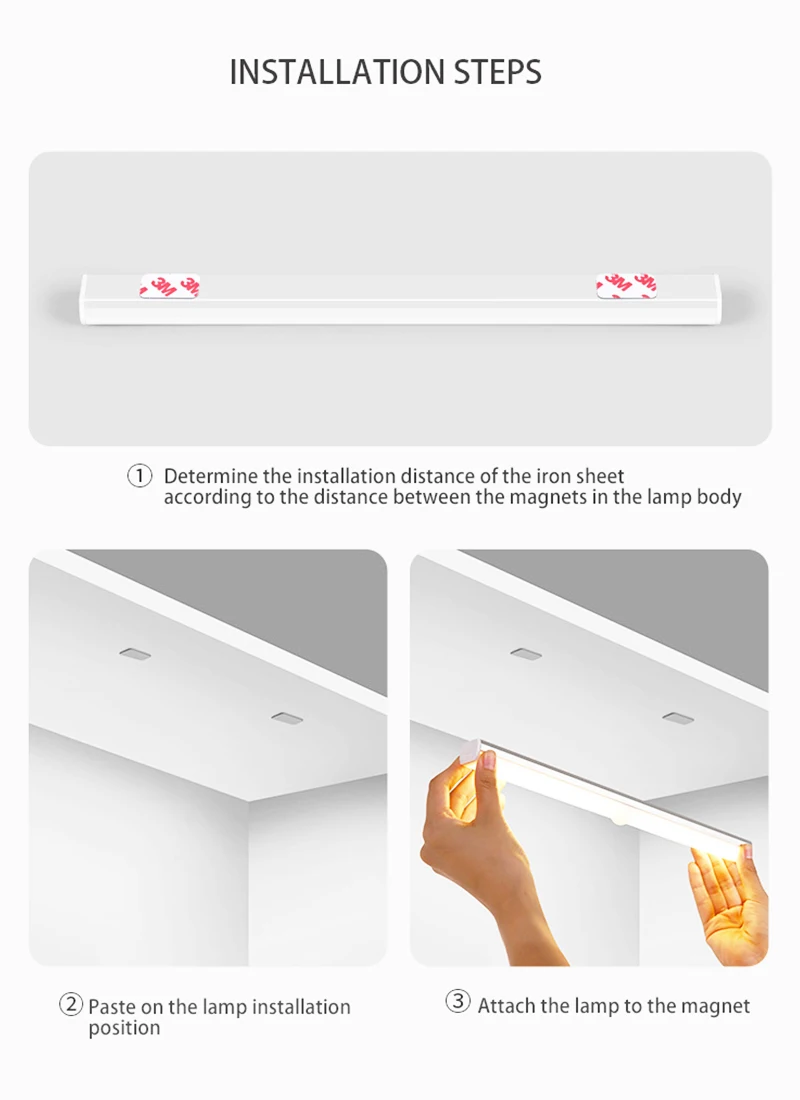 4. Метод фиксации-это тип магнитного всасывания. Снимите клей на обратной стороне магнита в посылка и Наклейте его на стену или шкаф. Индукционная лампа может всасываться на магните. Легко выбрать и разместить