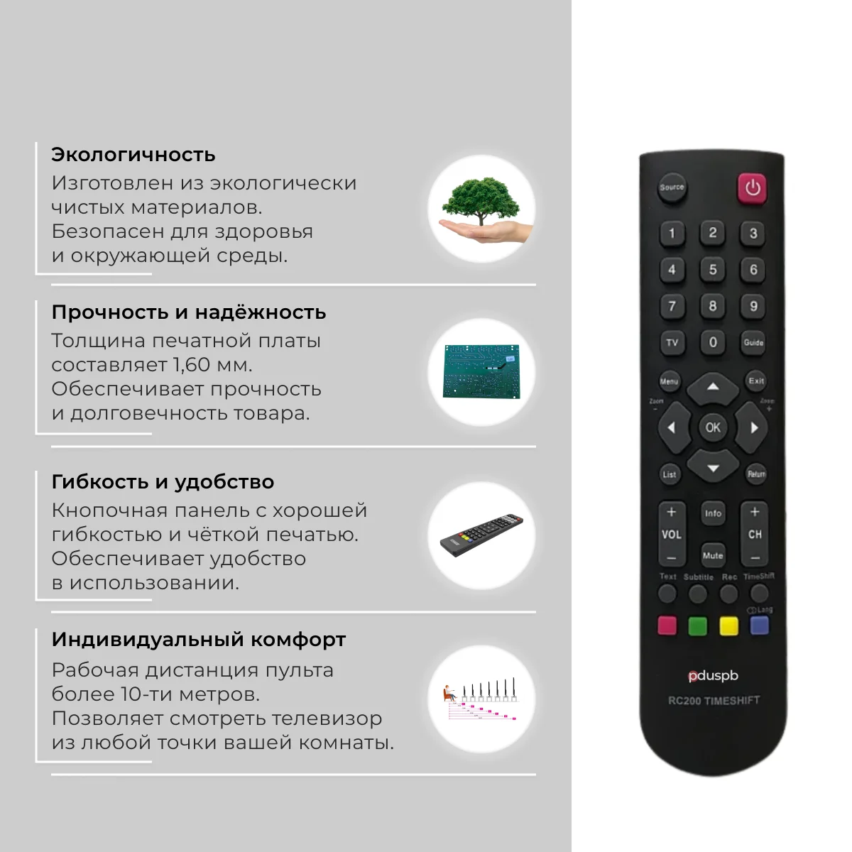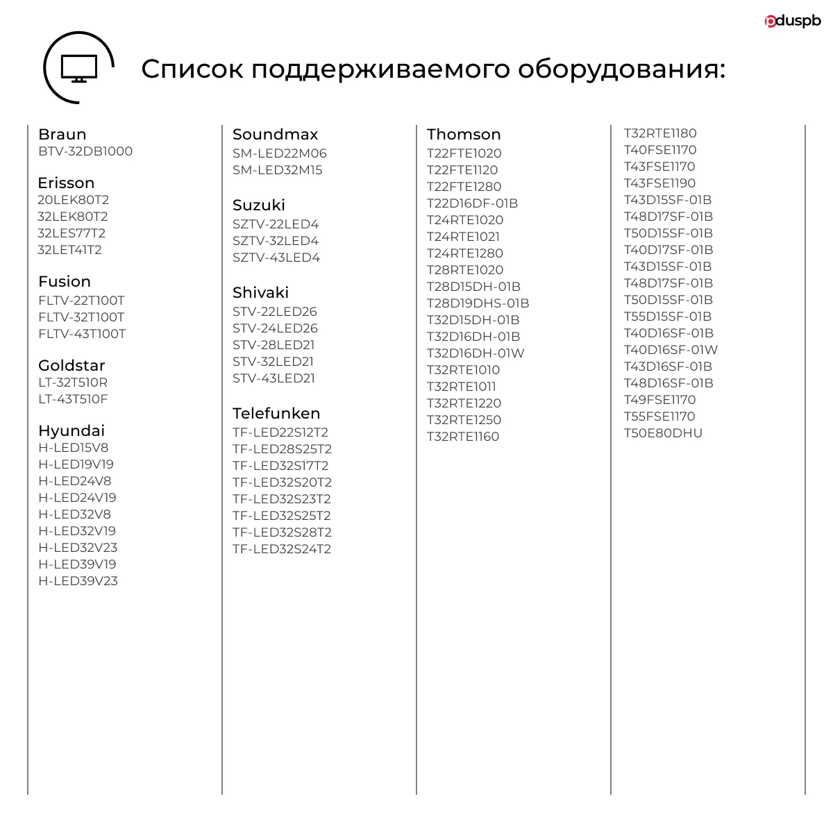 Внимание! Данный пульт НЕ универсальный. Он совместим только с телевизорами из списка поддерживаемого оборудования! Пожалуйста, внимательно ознакомьтесь с данным списком перед покупкой. Обращаем ваше внимание на то, что пульты PDUSPB имеют ряд преимуществ: