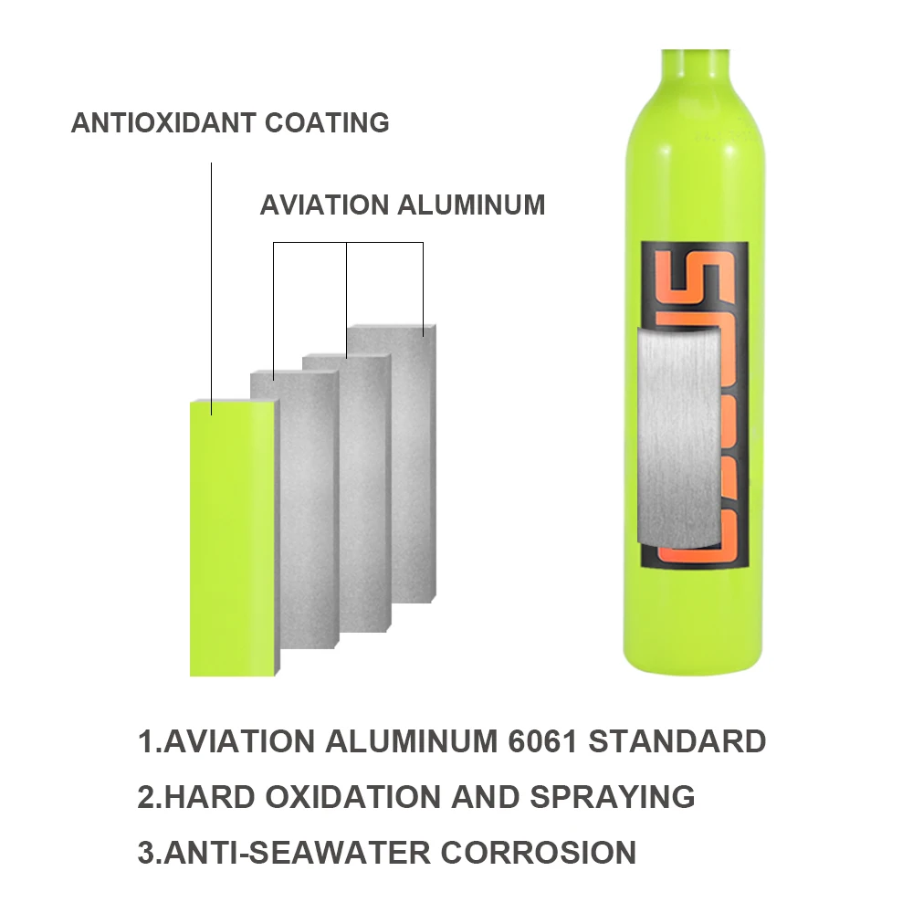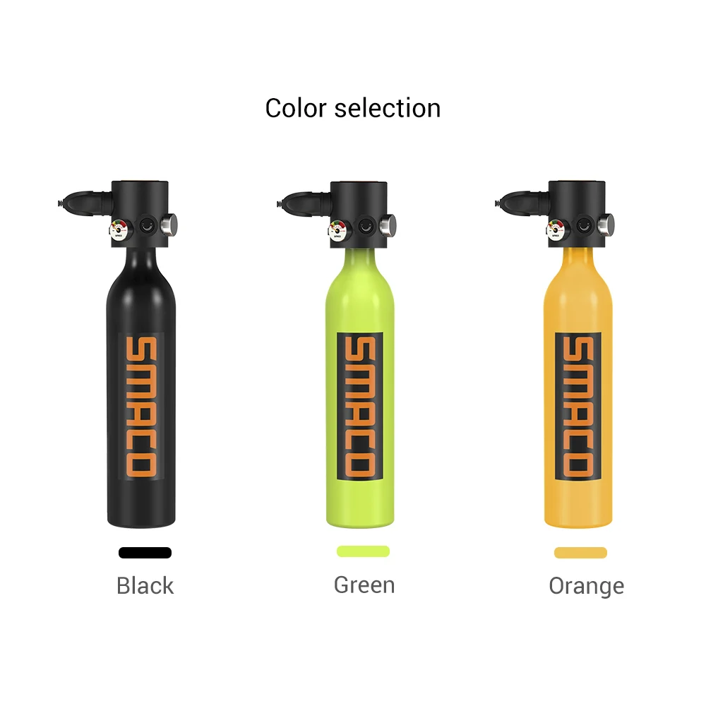 Кислородный цилиндр для дайвинга: Smaco S500 Емкость: 0,7л/700 мл Цвет: черный/зеленый/оранжевый Материал: авиационный алюминий 6061 Макс. Давление: 3000PSI / 200bar / 20MPa Количество Дыханий: 170 раз Доступное время: 10 ~ 15 мин (в зависимости от слоя воды) Макс. Время нахождения под водой: 15 минут Размер: около 37,6*7 см/14,8*2,75"