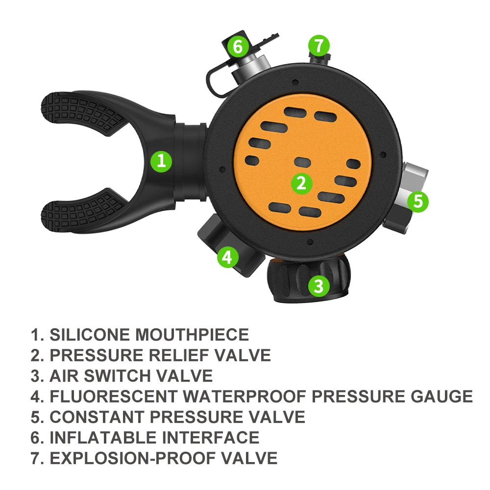 1. Этот продукт подходит для отдыха и дайвинга в пределах 10 м. Не пытайтесь использовать его в качестве источника воздуха в глубокой воде. 2. Этот продукт может быть использован в качестве резервного источника воздуха для отдыха дайвинга в пределах 30 метров. 3. Этот продукт подходит для воды выше 10 ℃ Цельсия. 4. Рекомендуемая максимальная скорость подъема составляет 15 м в минуту (для последних 6 м требуется 6 м в минуту). 5. Максимальное давление наполнения этого продукта составляет 3000 фунтов на кв. дюйм или 200 бар и может только заполнить сжатый воздух, который дышит человеческое тело. Газы с содержанием кислорода более 40% не могут быть использованы. 6. Держите продукт в прохладном сухом месте вдали от прямых солнечных лучей. Не храните в багажнике автомобиля или при высокой температуре или не ставьте его в огонь. 7. После наполнения воздуха, давление должно быть сначала выпущено. 8. Когда указатель указателя достигает Красной области, пожалуйста, Поднимитесь на поверхность, надуйте снова для использования.