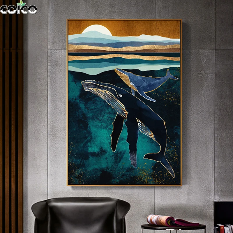 Картина из золотой фольги с рамкой, дельфин, осьминог, журавль, холст, живопись, море, животные, Настенная картина, декор для гостиной