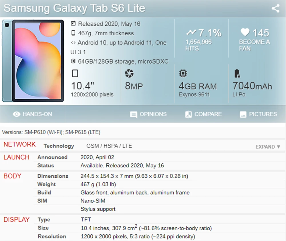 Номер моделиSamsung Galaxy Tab S6 Lite 10.4 2020