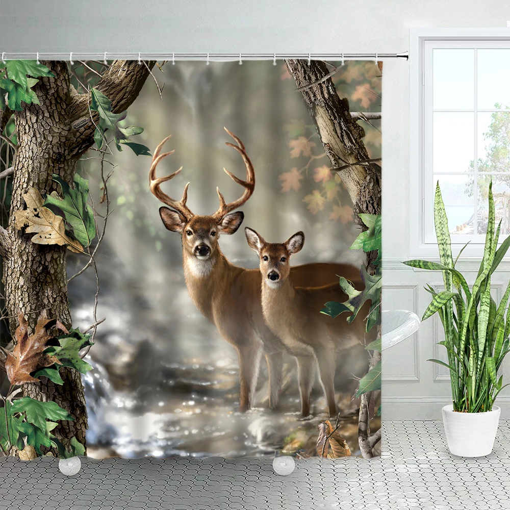 Шторы для душа с изображением диких животных, оленей, леса, кедра, оленей, природного ландшафта, Рождественское украшение с крючками, тканевые занавески для ванной комнаты