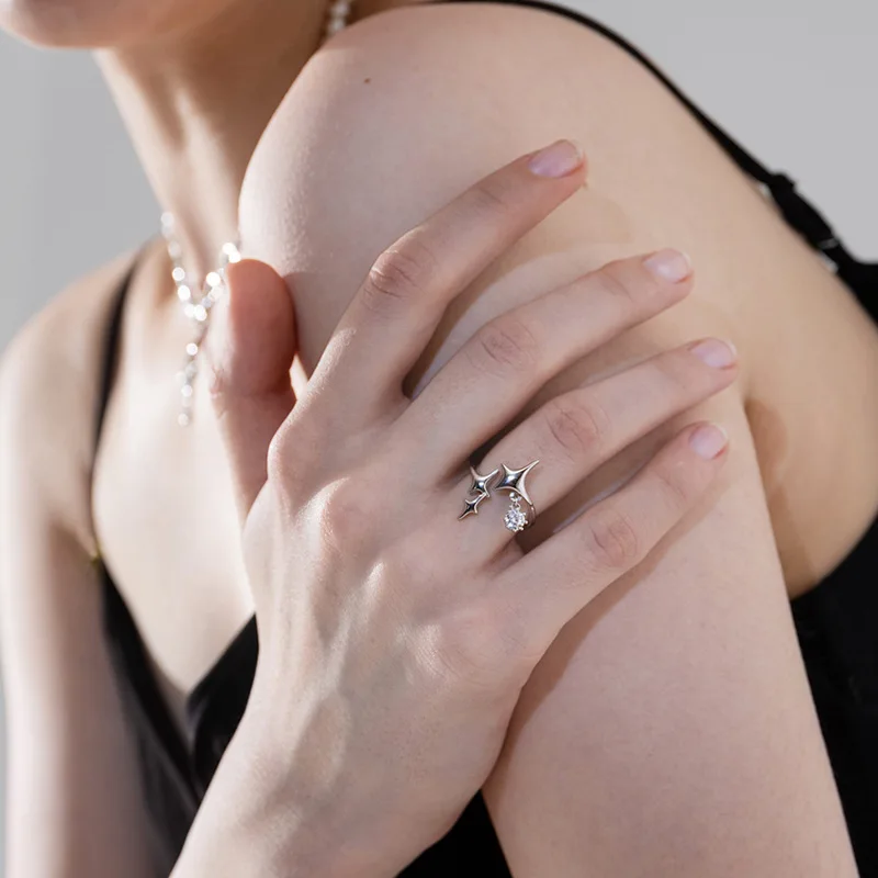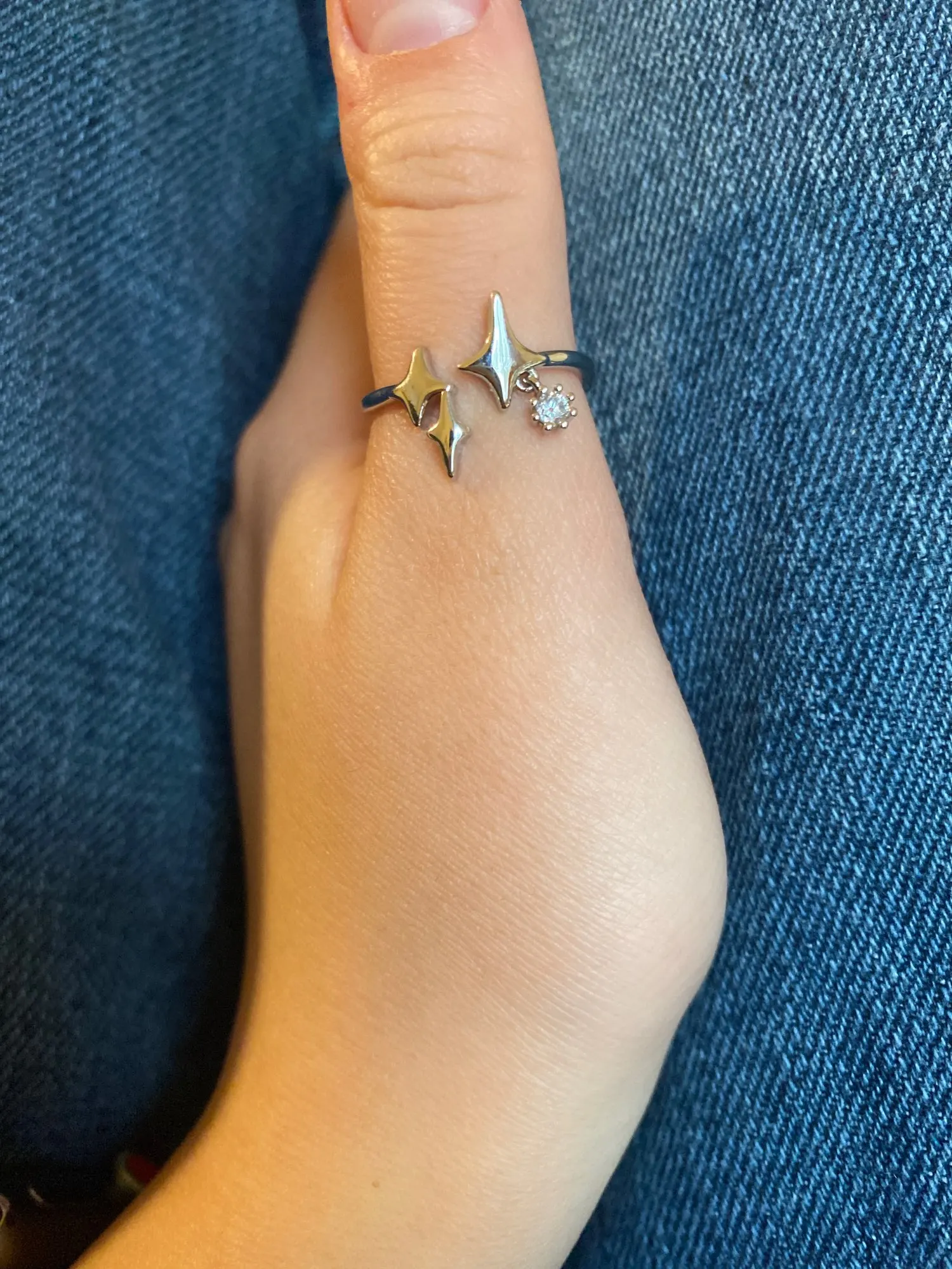 Женское кольцо с фианитом, серебристое кольцо с подвеской в виде четырех острых звезд, регулируемый размер