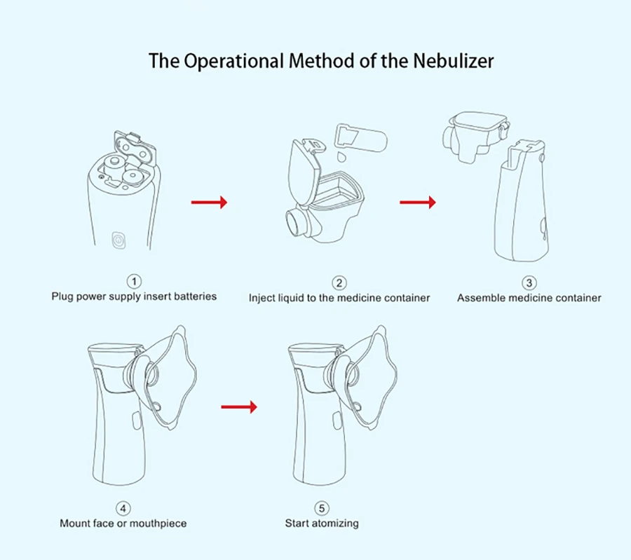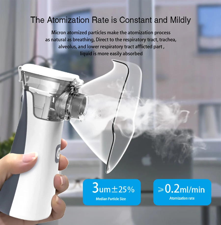 1. Низкий уровень шума, тихий и удобный распыление, небольшой голос;2. Мелкодисперсные частицы, ультратонкое распыление, проникающее глубоко в легкие, распыляемое отверстие около 1-3 мкм.(Помощь в обработке респираторных заболеваний, таких как простуда, мокрота, жар, кашель, астма, боль в горле, ринит, хронический фарингит, тонзиллит, бронхит и т. Д.)3. Мелкие частицы, большое количество распыления.4. Маленький и портативный, 2 * AA щелочные батареи или DC источник питания опционально.5. В зависимости от различных обстоятельств можно выбрать два способа распыления.6. Стаканчик для поликарбоната можно стерилизовать при высокой температуре; Стаканчик для лекарств отстегивается и полностью водонепроницаемый, легко чистится и дезинфицируется.7. Интеллектуальный режим низкой мощности, время работы в режиме ожидания.8. Самоочистка для предотвращения засорения.