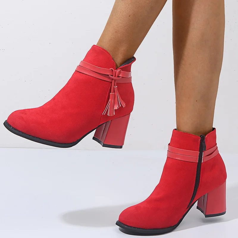 Женские ботинки с кисточками, красные, осенне-зимние короткие сапог...