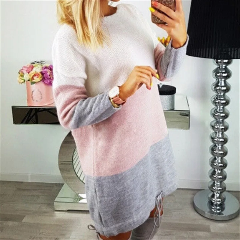 Зимние теплые женские платья 2021, вязаный кардиган с длинным рукавом, платье, Свободный Повседневный свитер в стиле пэчворк, топы, мини-одежда с круглым вырезом