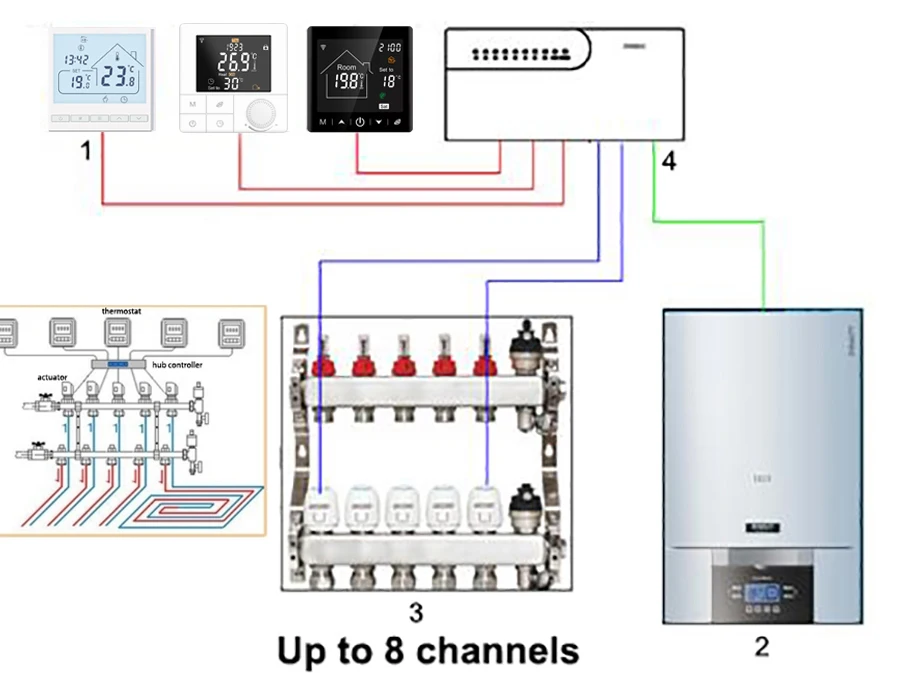 1. Subcontroller термостаты2. Бойлер (сухой контакт)3. NC электрические тепловые приводы (нормально закрытые)4. CCT-10 8 каналов концентратора контроллер