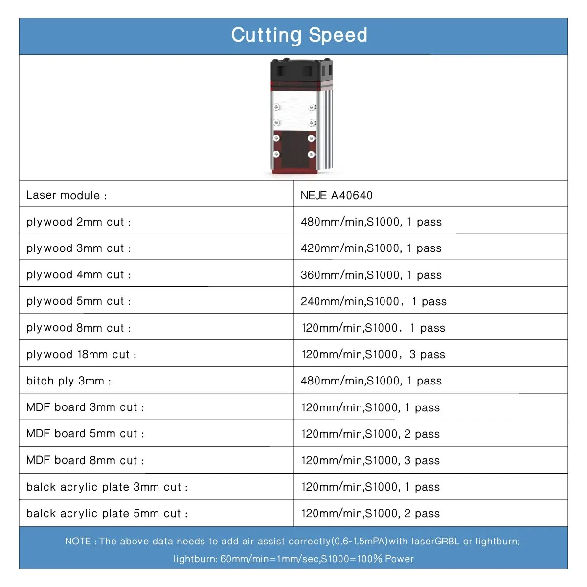 Модель: NEJE A40640 комплекты модулейМожет выгравировать: МДФ/балса/бумага/дерево/ткань/пластик/кожа/Фанера/акрил/ABS доска/ПВХ лист/PPR/PCBA/бакелит/углеродное волокно/металл краски/нержавеющая сталь/матовый стекло/булыжник/матовая керамикаМожно разрезать: MDF/Balsa/бумага/дерево/ткань/пластик/кожа/Фанера/нетканые/хлопок/лен/бархат/холст/акрил/ABS доска/ПВХ лист/EPE/KT доска/АкрилТехнические параметры:Оптическая Выходная мощность: 10 ВтДлина волны: 455-450нмФорма луча: точка (фокусируемая)Рабочее напряжение: 12 В постоянного токаМодуляция TTL и PWM: Да, Совместимость с модуляцией TTL и PWMВходное напряжение: DC12V 4APWM/TTL Вход: DC3.3V-12VВходной интерфейс: PH2.0-4Pin (+,-, ШИМ/TTL, температура), 3Pin (+,-, ШИМ/TTL) , 2Pin + 2Pin (+,-) + (ШИМ/TTL,-)Примечание: Температурный интерфейс может быть отключен, NEJE предоставляет текстовые инструкции по приобретению температуры на wiki.Режим привода: внешний ACCБезопасный диапазон температур:<60 ℃Вес модуля: 202 г (чем легче вес, тем меньше инерция движения, тем лучше производительность)Срок службы: 10000-20000 часов