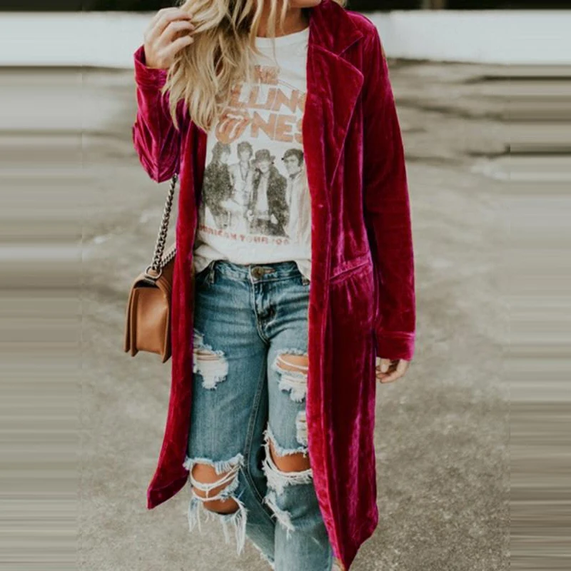 Женский длинный кардиган на пуговицах, однотонный бархатный кардиган с отложным воротником, элегантная офисная куртка для осени и зимы