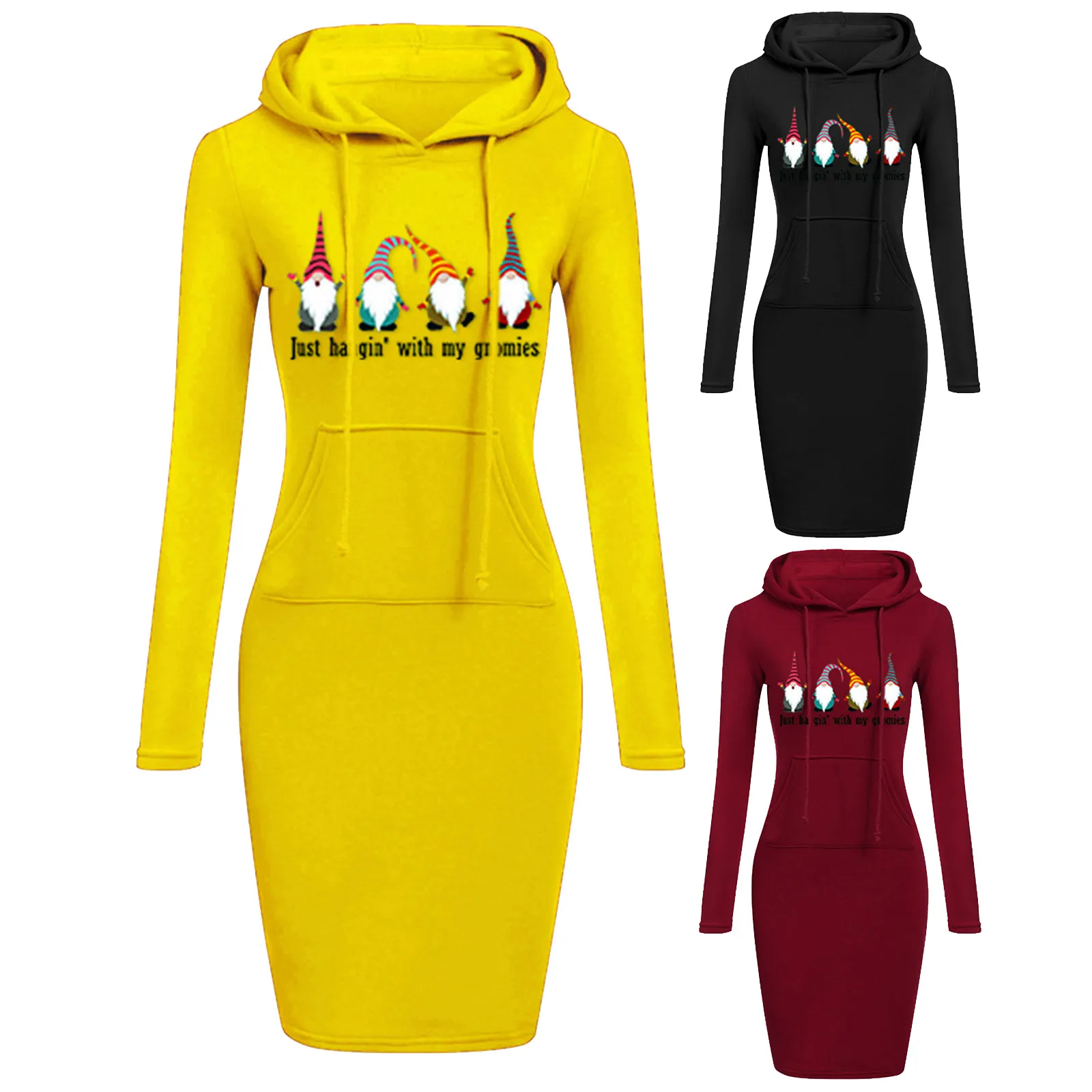 Женские Желтые рождественские платья, зима-осень, толстовка с капюшоном и карманами, сарафан, одежда с длинным рукавом и принтом, новогоднее платье 2022