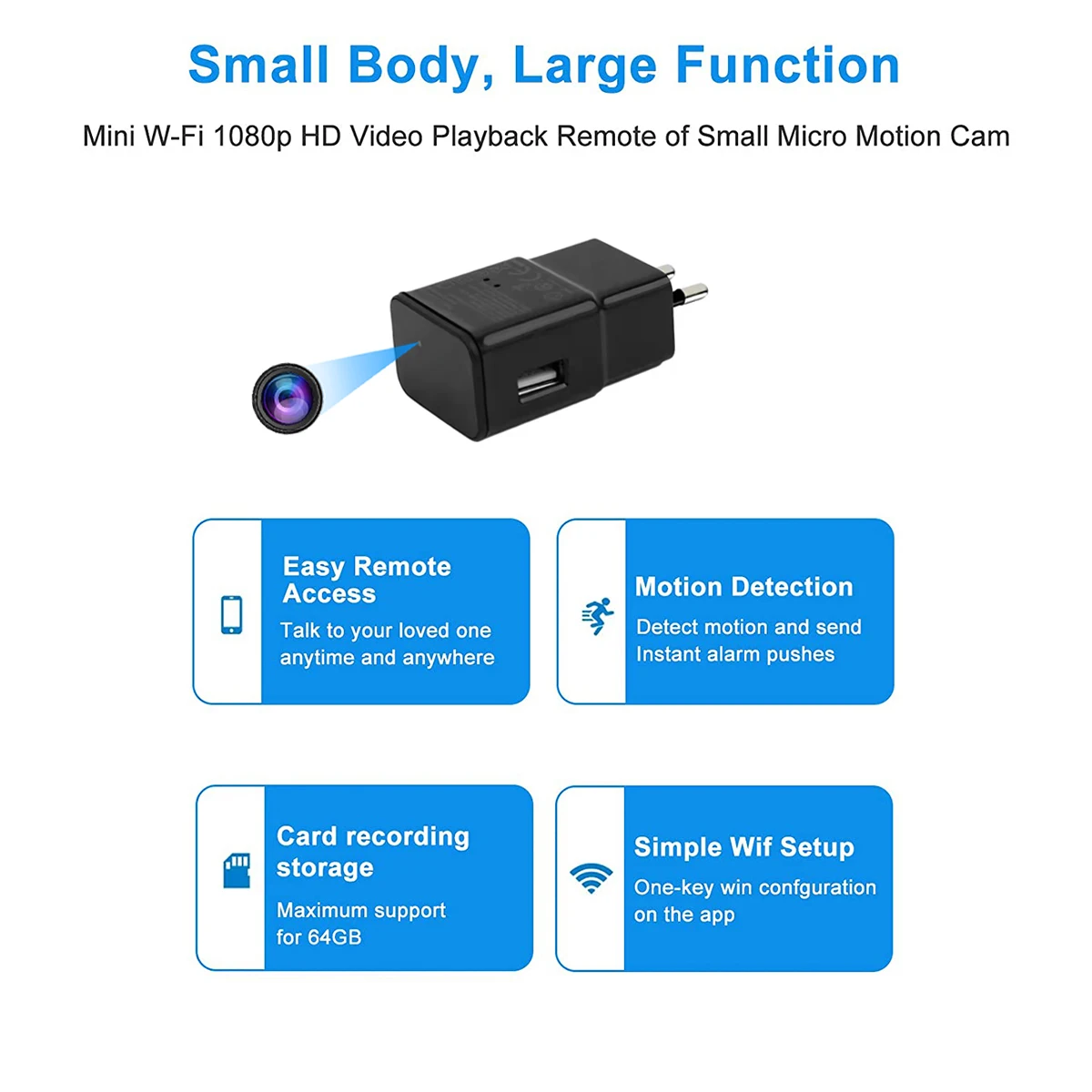 О товаре1. Зарядное устройство USB: эта камера безопасности также является зарядным устройством USB, она может записывать видео в формате full HD 1080P во время зарядки устройства, следить за ребенком дома, в офисе или автомобиле камеры безопасности, домашних животных, няня, воры или сотрудники.2. Обнаружение движения: при обнаружении движения, эта камера будет записывать видео Full HD 1080P, экономя больше места для хранения, чем режим циклической записи.3. Штепсель быстрого подключения и воспроизведения: Просто вставьте микрокарту, подключите ее к розетке или блоку питания или usb-порту для автоматической записи!4. Циклическая запись и автоматическое сохранение: эта камера безопасности имеет функцию циклической записи. Видеофайл автоматически сохраняется каждые 5 минут. Когда карта памяти заполнена, новейший файл перезаписывает старый файл. Вы никогда не пропустите важные вещи, которые вы хотите знать. Напоминание: мы предлагаем организовать файлы вовремя, чтобы сохранить важные видеофайлы.)5. Для работы в качестве реального настенного зарядного устройства USB: он может записывать звук. Это зарядное устройство для мини-смарт-камеры может работать как настоящее настенное зарядное устройство USB.1. Угол обзора 90 градусов2. Объем памяти до 128 ГБ3. Сжатие кода: H. 2644. Формат файла: AVI5. Время записи: 7 / 24 рабочих во время зарядки6. Входная мощность: 5 В 1A-2A7. Разъем: USB 208. Размеры корпуса 72*33 мм (Д "Ш)9. Вес 50 гПримечание: на поверхности вилки имеется защитная пленка, которая делает ее старой. Все продукты не используются. Если оторвать защитную пленку объектива, она выглядит новой.Посылка:1 мини wifi камера,1 х РуководствоКард-ридер-1 шт.1 x pin