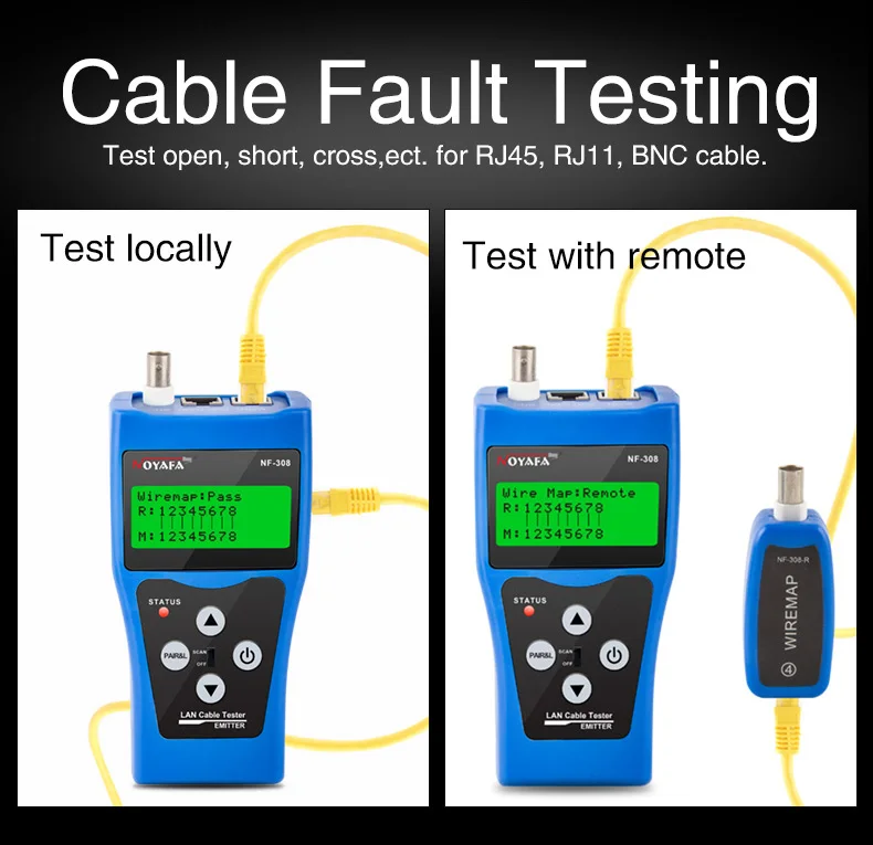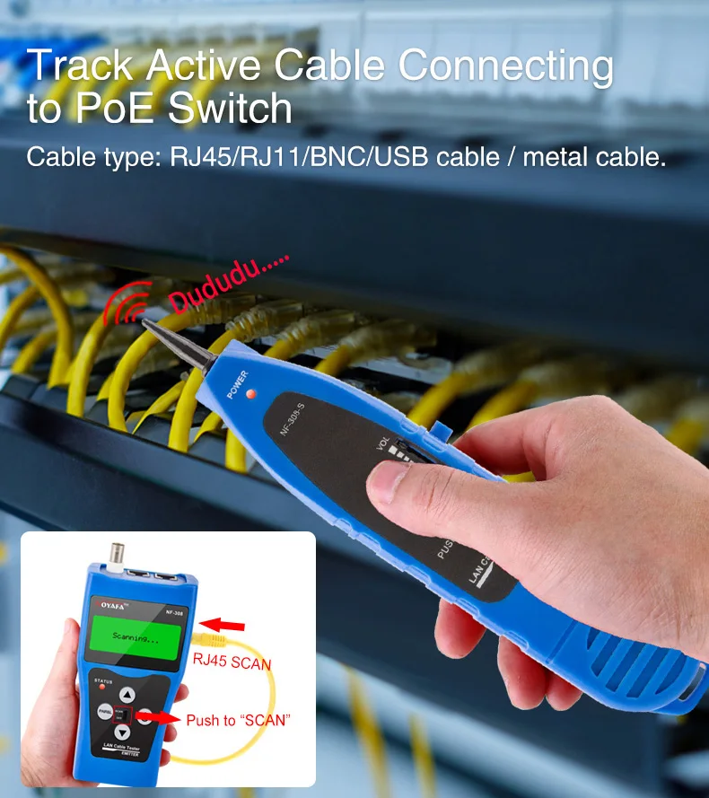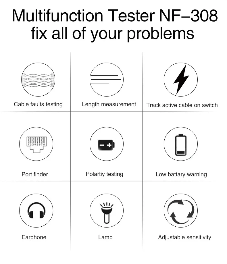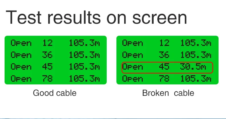 Особенности:1. Непосредственно Охота 5E, 6E, телефонный провод, коаксиальный кабель, USB кабель и другие кабели.2. Мигание концентратора для определения местоположения сетевого порта через мигающий светильник порта на ступице/переключателе.3. Проверьте ошибку проводки в 5E, 6E, коаксиальный кабель, такой как открытая цепь, короткое замыкание, перемычка, обратное соединение."4. Обнаружите ошибку подключения или подключения.5. Измерьте длину кабеля до 1000 м и найдите точку поломки.6. Полярности Функция измерения напряжения постоянного тока (0,5-60 V)7. Память и память для калибровки данных.8. Автоматическое отключение с задержкой времени и функция оповещения о низком заряде батареи.