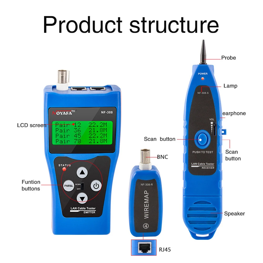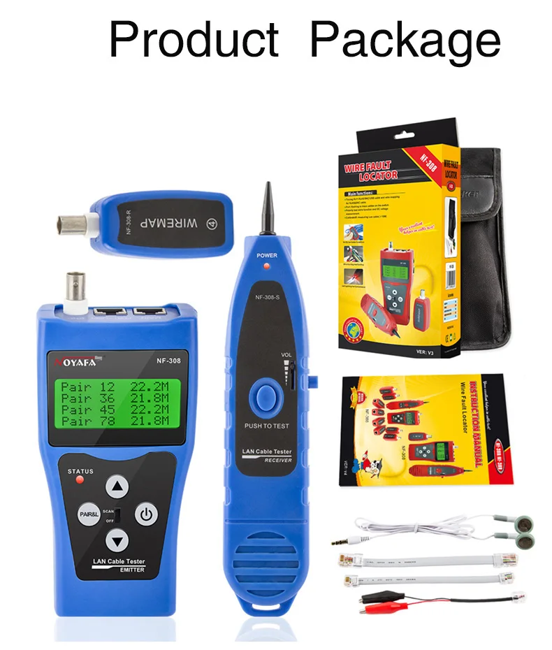 Технические показатели:Характеристики передатчика NF-308Indictor LCD 53x25 мм, с задний светильникЧастота тона 225 ГцМакс. Расстояние передачи 2 кмМакс. Расстояние карты кабеля 1 кмМакс. Рабочий ток менее 70 мАРежим тона 2 тона регулируемыйСовместимые разъемы RJ11,RJ45,Coacial, USBМакс. Напряжение сигнала 15Vp-pВыбор функций: 3 кнопки положения и 1 выключатель питанияФункция и неисправности ЖК-дисплея ЖК-дисплей (карта, тон, короткий, без адаптера, низкий аккумулятор)Индикация карты кабеля LCD (#1-#8)Экранированная Индикация LCD ( #9)Защита напряжения AC 60V/DC 42VТип батареи DC9.0V(NEDA 1604/6F22 DC9V x 1 шт)Размеры (lxwx) 185x80x32ммХарактеристики приемника NF-308Частота 225 кГцМаксимальный рабочий ток менее 70 мАДомкрат 1Светодиодный светильник 2Тип батареи DC9.0V(NEDA 1604/6F22 DC9V) x1pcРазмеры (Д х Ш х Г) 218x46x29 ммNF-308 Технические характеристики пульта дистанционного управленияСовместимые разъемы RJ45, BNCРазмер (lxwx) 107x30x24мм