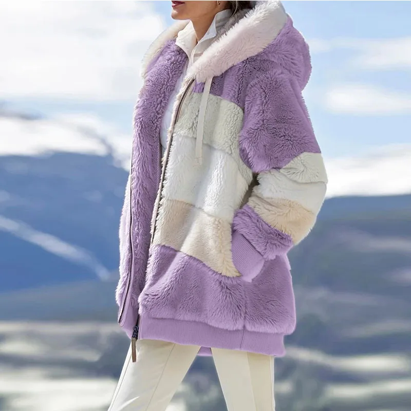 Зимняя женская куртка, плюшевая куртка с капюшоном и карманами на молнии в стиле пэчворк, женское меховое пальто, толстый теплый женский топ, зимняя верхняя одежда