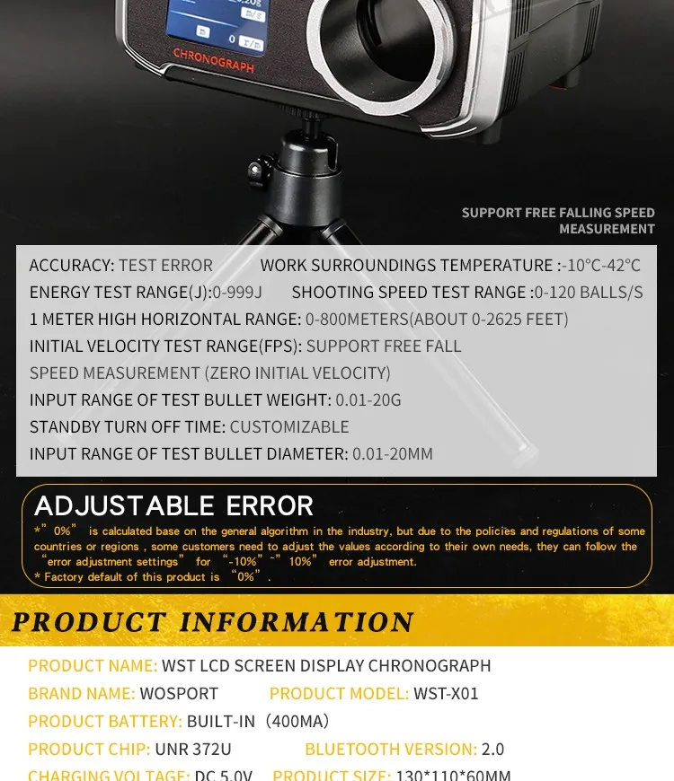 Описание товара* Батарея Продукта: встроенный (400мА)* Чип продукта: UNR 372U* Версия Bluetooth: 2,0* Напряжение зарядки: DC5.0V* Размер продукта: 130*110*60 мм* Вес изделия: около 250 г (вес нетто)* Поддержка системы Android и системы IOS* Компоненты продукта: хронограф, штатив и USB* Выбор языка: китайский (упрощенный); Китайский (Традиционный); Английский; Немецкий; Итальянский; Японский; Русский; ПольскийОсобенности* Рабочая температура: 10 °C-42 °C* Диапазон испытаний энергии (J): 0-999J* Диапазон измерения скорости съемки: 0-120 шариков/с* 1 метр высокий Горизонтальный диапазон: 0-800 метров (около 0-2625 дюймов)* Диапазон тестирования первой скорости (FPS): Поддержка бесплатного осеннего теста (нулевая первая скорость)* Вход Диапазон испытаний вес мяча: 0,01-20 г* Время выключения в режиме ожидания: настраиваемый* Вход Диапазон испытаний диаметр шара: 0,01-20 мм