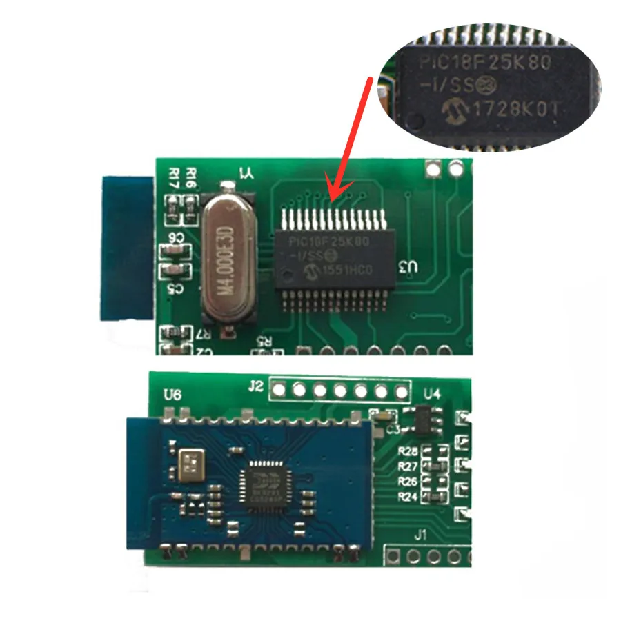 1. Чип PICI8F25K80, настоящая версия ELM327 1,5, поддержка протокола 9, включает SAE-J1850 PWM , JAE J1850 VPW (для старых автомобилей F-ord и старых автомобилей G M Используйте этот протокол, как Explorer 1998)