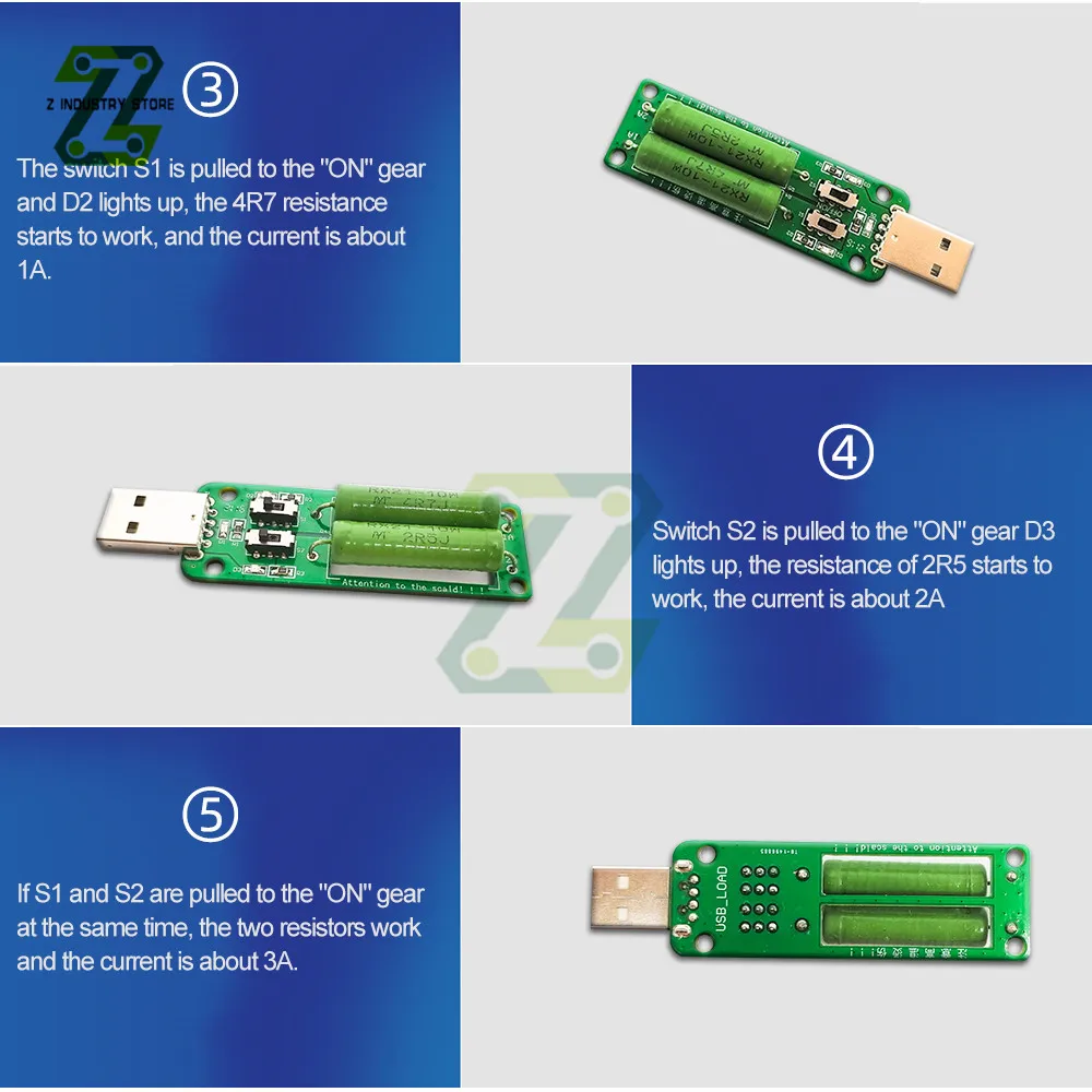 Согласно законам Ома (значение напряжения/сопротивления = выходной ток), устройство для разрядки USB предназначено для загрузки различных значений сопротивления мощности через два переключателя выше, И 3 типа старения тока могут быть получены, которые являются 1A/2A/3A. Встроенные соответствующие Световые индикаторы и индикатор питания с различными сопротивлениями ясны. Он прост в использовании и используется для тестирования старения мобильного зарядного устройства power bank.